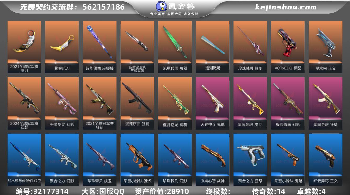皮肤资产价值:28910 已用源晶点数:715 超时空卫队 三棱军刺,短剑-流星兵团 爪刀-2021全球冠军赛,紫金爪刀-紫阙金琅//2.0 短剑-珍珠棘贝 超能偶像 应援棒 澄湖潋滟 幻影-2024全球冠军赛,幻影-千灵华绽,狂徒-2021全球冠军赛,狂徒-混沌序曲,戍卫-紫阙金琅,幻影-般若假面,狂徒-紫阙金琅,幻影-聚合之力,幻影-珍珠棘贝,狂徒-超能偶像,狂徒-流星兵团,獠犬-采蜜小蜂队,獠犬-复古浪潮,戍卫-战术熊与伙伴们,戍卫-超能偶像,戍卫-珍珠棘贝 蜂刺-聚合之力,蜂刺-纤云弄巧,蜂刺-深海水族,骇灵-流星兵团,骇灵-珍珠棘贝 奥丁-流星兵团,战神-采蜜小蜂队,战神-深海水族 冥驹-偃月苍龙,飞将-聚合之力,飞将-战术熊与伙伴们,冥驹-复古浪潮,莽侠-深海水族,莽侠-纤云弄巧 标配-VCTxEDG,正义-塑水宗,鬼魅-天界神兵,标配-超能偶像,标配-星际猎兵,标配-战术熊与伙伴们,短炮-深海水族,短炮-纤云弄巧,鬼魅-采蜜小蜂队,鬼魅-幻心猎手,鬼魅-流星兵团,狂怒-聚合之力,狂怒-战术熊与伙伴们,狂怒-珍珠棘贝,蒙太奇 狂怒,正义-超限闪存,正义-复古浪潮,正义-纤云弄巧 判官-采蜜小蜂队,判官-超能偶像,雄鹿-复古浪潮 布鲁诺中校卡面,采蜜小峰队卡面,超能偶像卡面,复活专家卡面,分神的决斗者卡面,无畏契约GO!第一卷:捷风卡面,无畏契约GO!第一卷:零卡面,无畏契约GO!第一卷:芮娜卡面,钢锁工牌卡面,归乡蝰蛇卡面,红鳞松叶卡面,虹吸式咖啡壶卡面,聚合之力卡面,看镜头卡面,狼人猎手卡面,梦幻奶茶卡面,情人节不死鸟卡面,情人节捷风卡面,热舞环节卡面,势不可挡盖可卡面,势不可挡贤者卡面,失而复得卡面,声感陷阱设计图卡面,生意人麦宝卡面,铁之华卡面,VCTCN首冠卡面,星宿灿烂猎枭卡面,艺无止境火焰卡面,艺无止境坚不可摧卡面,艺无止境灵感卡面,最高舞台卡面,战术小伙伴的夏日卡面,终章:生意人麦宝卡面 卖家说:21套 24幻影 三棱 有神话表和超凡标
