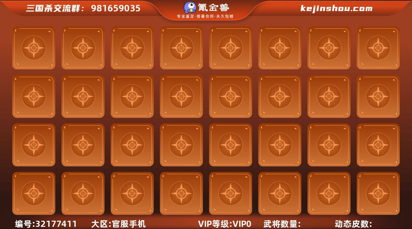 官阶:大将军;VIP等级:VIP12;史诗武将数量:53;动态皮肤数量:27;武将总数:411;史诗宝珠数量:38;将魂数量:2409;神将:9;魏国史诗武将:20;蜀国史诗武将:11;吴国史诗武将:7;群史诗武将:17 神吕布,神赵云,神司马懿,神甘宁,神张辽,神关羽,神吕蒙,神周瑜,神诸葛亮,王粲,杨修,王元姬,王朗,魏-司马昭,界钟会,界曹真,嵇康,陈琳,曹纯,戏志才,刘晔,关索,马云騄,谋马超,诸葛瞻,周群,赵襄,张星彩,王平,谯周,花鬘,董允,孙皓,孙寒华,骆统,留赞,界徐盛,界步练师,贺齐,左慈,张让,王允,陶谦,司马徽,麹义,庞德公,南华老仙,祢衡,刘焉,沮授,界李儒,卑弥呼,李傕,许攸,友徐庶,星董卓,神郭嘉-虎年清明(动态),神荀彧-虎年清明(动态),神甘宁-万人辟易(动态),神司马懿-徐图大略,神曹操-天下归心,神吕布-监兵噬魅(动态),神司马懿-鉴往知来(动态),钟繇-安民护祚(动态),甄姬-洛水神韵(动态),荀彧-驱虎吞狼(动态),邓艾-神兵天降(动态),王粲-笔翰如流(动态),界甄姬-洛水神韵(动态),界邓艾-神兵天降(动态),钟会-谋谟之勋(动态),界钟会-谋谟之勋(动态),司马昭-昭威淮南(动态),星徐晃-斧引霹雳(动态),费祎-安民护祚(动态),关羽-明良千古(动态),关银屏-兔年春节(动态),马云騄-明良千古(动态),赵襄-猪年春节(动态),关索-虎年七夕(动态),胡金定-明良千古(动态),诸葛果-蛇年限定(动态),周瑜-兔年七夕(动态),孙策-虎踞江东(动态),孙寒华-威灵尽显(动态),孙权-牛年七夕(动态),孙尚香-兔年春节(动态),界孙权-牛年七夕(动态),步练师-牛年七夕(动态),界步练师-牛年七夕(动态),孙鲁育-猪年春节(动态),刘赞-抗音而歌(动态),孙寒华-蛇年限定(动态),貂蝉-舞惑群心(动态),貂蝉-鼠年七夕(动态),吕布-鼠年七夕(动态),界吕布-鼠年七夕(动态),界貂蝉-鼠年七夕(动态),董白-猪年春节(动态),刘焉-雄踞益州(动态),祢衡-击鼓骂曹(动态)