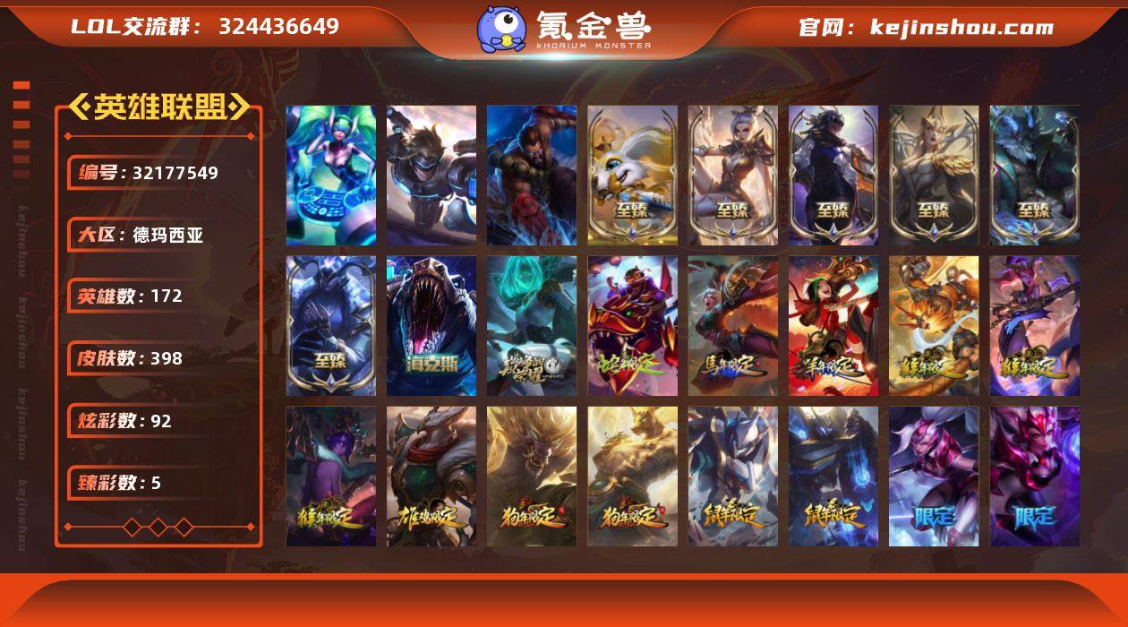 t37534 皇冠账号【德玛西亚】原皮龙瞎 398皮肤 92炫彩 5臻彩 10神话/74限定/32传说/172英雄 账号等级:489 云顶神话:2 【重要头像】觅心之翼奎因 春晖神女拉克丝 幼犬内瑟斯 沐浴震惊 披萨鸡 送披萨的小姐姐希维尔 战斗学院伊泽瑞尔神话炫彩 西部魔影卢锡安炫彩头 【重要皮肤】DRX亚托克斯至臻 北极星使者沃里克至臻 魔女乐芙兰至臻 真实伤害赛娜至臻 绒毛菲兹至臻 玉剑传说武剑仙至臻 海克斯科技雷克顿 胜利之王泰达米尔 庆典女皇艾尼维亚 玉剑传说舞剑仙 龙的传人李青 替父从军花木兰 神龙烈焰金克丝 古琴余韵娑娜 北辰之威内瑟斯 南天之怒沃里克 美猴王孙悟空 玉净夜叉凯特琳 紫金罗刹莫甘娜 司马懿仲达 神龙之翼库奇 胜利女神奥莉安娜 胜利枪神卢锡安 甜心宝贝安妮 觅心之翼奎因 寒冬精灵璐璐 魄罗骑士瑟庄妮 夺命美人卡特琳娜 灵魂收割者索拉卡 海之歌艾希 斩星魔剑易 送披萨的小姐姐希维尔 克格汪 iG菲奥娜 SKTT1卡莉丝塔 SKTT1伊莉丝 SKTT1雷克顿 SSW锤石 SSW泰隆 SSW辛吉德 SKTT1贾克斯 SKTT1婕拉 SKTT1薇恩 暗杀星蒙多 暗杀星努努和威朗普 Fnatic古拉加斯 Fnatic嘉文四世 Fnatic卡尔萨斯 冰雪节辛吉德 防暴士兵格雷福斯 防暴士兵辛吉德 防暴天使凯尔 冠军之血希瓦娜 春晖神女艾希 鬼影森森茂凯 鬼影重重魔腾 海贼瑞兹 胡桃夹子萨科 惊悚派对阿木木 警用试作体K9内瑟斯 圣诞精灵崔丝塔娜 圣诞狂欢基兰 圣诞老人古拉加斯 圣诞驯鹿克格莫 糖果使徒费德提克 卧虎藏龙贾克斯 无头骑士赫卡里姆 喜庆之树茂凯 邪恶圣诞老人维迦 幸福女神乐芙兰 野兽猎人德莱文 勇者阿狸 勇者奈德丽 暗影沃里克 诺斯费拉图弗拉基米尔 阿木木主人不要我了 波比的巧克力工坊 地底世界崔斯特 都铎王朝图奇 十周年纪念安妮 源代码乐芙兰...