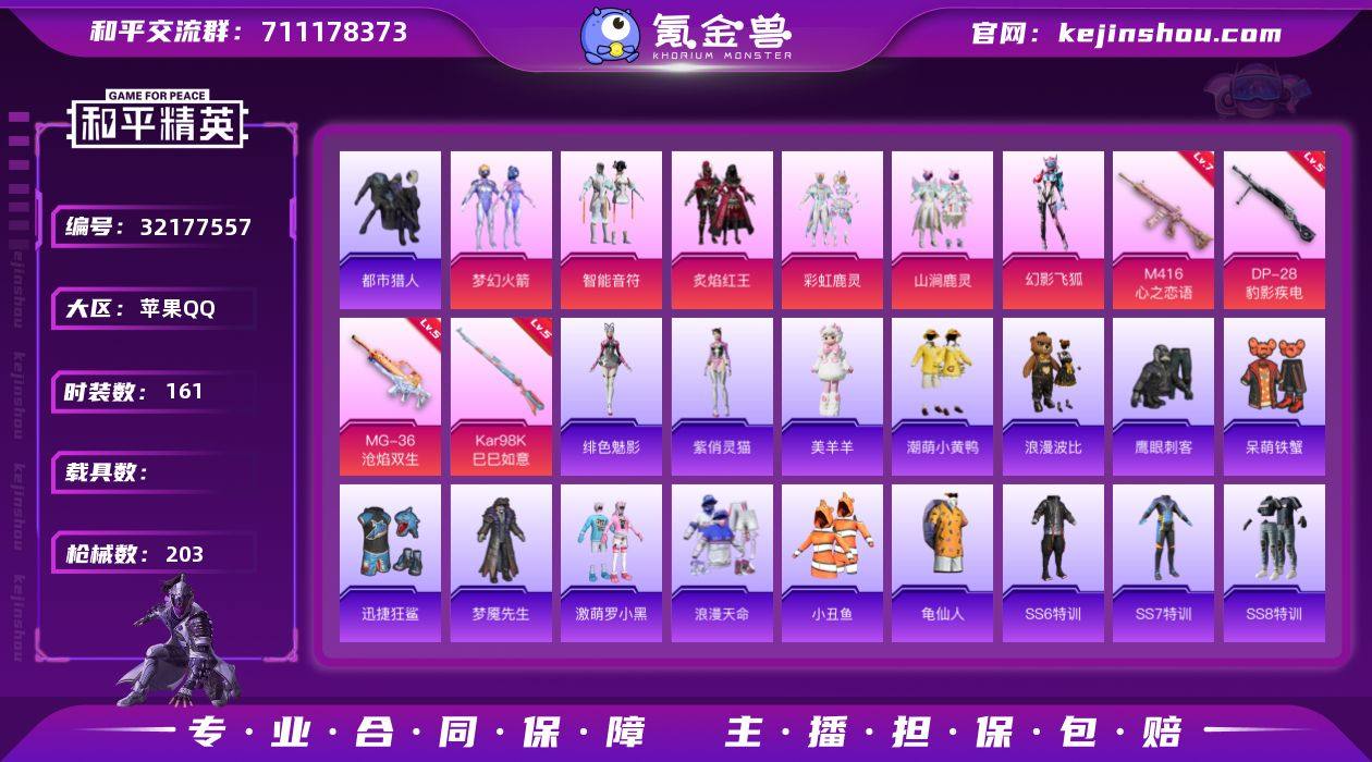 苹果 【男神号 梦幻火箭/浪漫天命/都市猎人/M416-心之恋语(七级)】手Q-6粉装-5特效枪-0载具-2粉色飞行器-59199热力值-8王牌印记-161套装-203枪皮 【热门品类】:粉装-梦幻火箭,套装-浪漫天命,套装-都市猎人,套装-小丑鱼,套装-龟仙人,套装-潮萌小黄鸭,套装-浪漫波比 【粉色套装】:粉装-梦幻火箭,粉装-智能音符,粉装-炙焰红王,粉装-彩虹鹿灵,粉装-山涧鹿灵,粉装-幻影飞狐 【粉色枪皮等级】:M416-心之恋语(七级),Kar98K-巳巳如意(五级),Mk14-福马献瑞(三级),DP-28-豹影疾电(五级),MG-36-沧焰双生(五级) 【粉色枪皮】:M416-心之恋语,Kar98K-巳巳如意,Mk14-福马献瑞,DP-28-豹影疾电,MG-36-沧焰双生 【粉色飞行器】:炫彩糖果飞行器,繁龙极客飞行器 【粉色降落伞】:林间仙鹿降落伞,蓝莓炮弹降落伞,未来歌姬降落伞,变形金刚降落伞,拂晓神骑降落伞,精灵梦叶罗丽降落伞,忍者神龟降落伞,桃粉嫣然降落伞,喜羊羊与灰太狼降落伞,异瞳寒姬降落伞,炫彩糖果降落伞 【稀有套装】:套装-龟仙人,套装-雪国风尚,套装-炫彩糖果,玩偶服-美羊羊,角色-绯色魅影,角色-紫俏灵猫 【稀有枪皮】:AKM-彩虹符号,AKM-影袭,AKM-海渊国主,AKM-环太平洋,AKM-破晓战魂,AKM-缤纷海域,AKM-虎虎生威,AKM-霓虹街区,AKM-龙的传人,M16A4-幻世战舞者,M16A4-甜心亚梦,M16A4-红色方程式,M16A4-蓝色火焰,SCAR-L-炫彩节奏,SCAR-L-玉兔迎春,SCAR-L-红色方程式,SCAR-L-黄金龙骨,M416-夜灯,M416-月影鸳鸯,M416-糯团青竹,M416-红色方程式,M416-罗小黑,M416-蓝色火焰,GROZA-异彩先驱,GROZA-影袭,GROZA-懵萌河马,GROZA-林间仙鹿,GROZA-田园牧歌,GROZA-黑色刀锋,AUG-2P战斗服款,AUG-耀粉歌者,AUG-魔法学院,QBZ-彩虹符号,QBZ-飞驰魅影,M762-天星战神,M762-天降萌叽,M762-奇异狩猎者,M762-拳...