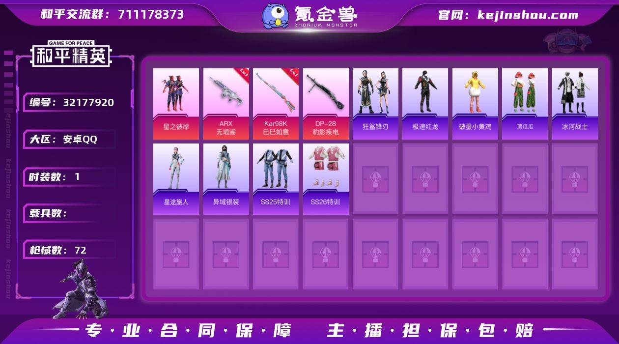 M1046769【1粉装-6特效枪素材】无二次包-安卓手Q-1粉装-6特效枪-35套装-72枪皮-3王牌印记-超级王牌4星-20783热力值【1粉装】星之彼岸【6特效枪】Mk14-福马献瑞[5级],AKS-74U-森灵之息[5级],ARX-无垠阁[7级],ACE32-萌骑漫游[5级],DP-28-豹影疾电[5级],Kar98K-巳巳如意[5级]【5飞行器】鸡智如我飞行器,炫彩糖果飞行器,异域银装飞行器,狂鲨锋刃飞行器,马上有福飞行器【100其它衣服和枪皮】SS29特训,SS33特训,顶瓜瓜,福马献瑞,SS34特训,萌鸡速递,马上有钱,玩偶服-懒羊羊,元气之梦,战术大师,SS31特训,狂鲨锋刃,魅力单车,狙击之神,SS36特训,极速红龙,SS25特训,SS37特训,猛禽,薄荷星砂,角色-幽雨猫猫,雪国风尚,长空猛禽,SS26特训,星途旅人,黑色伏地魔,SS35特训,青翼流星,破蛋小黄鸡,冰河战士,竞技名士,异域银装,炫彩糖果,角色-绯色魅影,十字弩-异域银装,AUG-异域银装,电击枪-喜羊羊与灰太狼,GROZA-紫矿核心,AUG-紫晶流影,MG-36-薄荷星砂,破片手榴弹-爆破雪人,M249-冰晶雪宝,UZI-红色方程式,M416-红色方程式,M417-玩趣呆呆,P90-紫矿核心,蜜獾-鸡智如我,UMP45-蓝色火焰,P90-巳巳如意,AKM-霓彩脉冲,SCAR-L-红色方程式,平底锅-属我最6,汤姆逊-像素花束,撬棍-冰晶雪宝,烟雾弹-冰氧夏日,AMR...