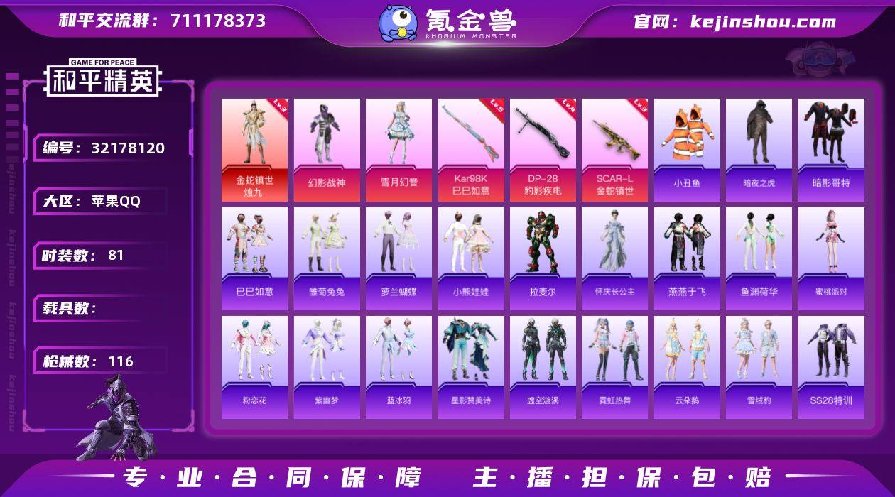 YZJ15531-可二次-苹果Q-1红装2粉装9特效枪7热门【极品神装素材号 3级神装烛九 烬夜之誓 幻影战神 暗夜之虎 小丑鱼 怀庆长公主 曹焱兵 蜜桃派对 红眼罩 1级圣域金龙飞行器 金蛇镇世背包头盔 幻彩电音背包 6款飞行器】81套装116枪皮 35822热力值 5印记 历史卓越王牌9星 【1红装】 金蛇镇世-烛九 (3级) 【3粉装】 烬夜之誓 雪月幻音 幻影战神 【9特效枪】 SCAR-L-金蛇镇世 (3级) AKS-74U-森灵之息 (2级) Kar98K-巳巳如意 (5级) DP-28-豹影疾电 (4级) M24-虎痴许褚 (2级) AKS-74U-森灵之息 (2级) Mk14-福马献瑞 (4级) PKM-萌骑夺宝 (1级) UMP45-萌骑冒险 (3级) 【7热门】 小丑鱼 暗夜之虎 暗夜之虎 暗影哥特 漫步者 破蛋小黄鸡 黑色刀锋 营地ID:968154401