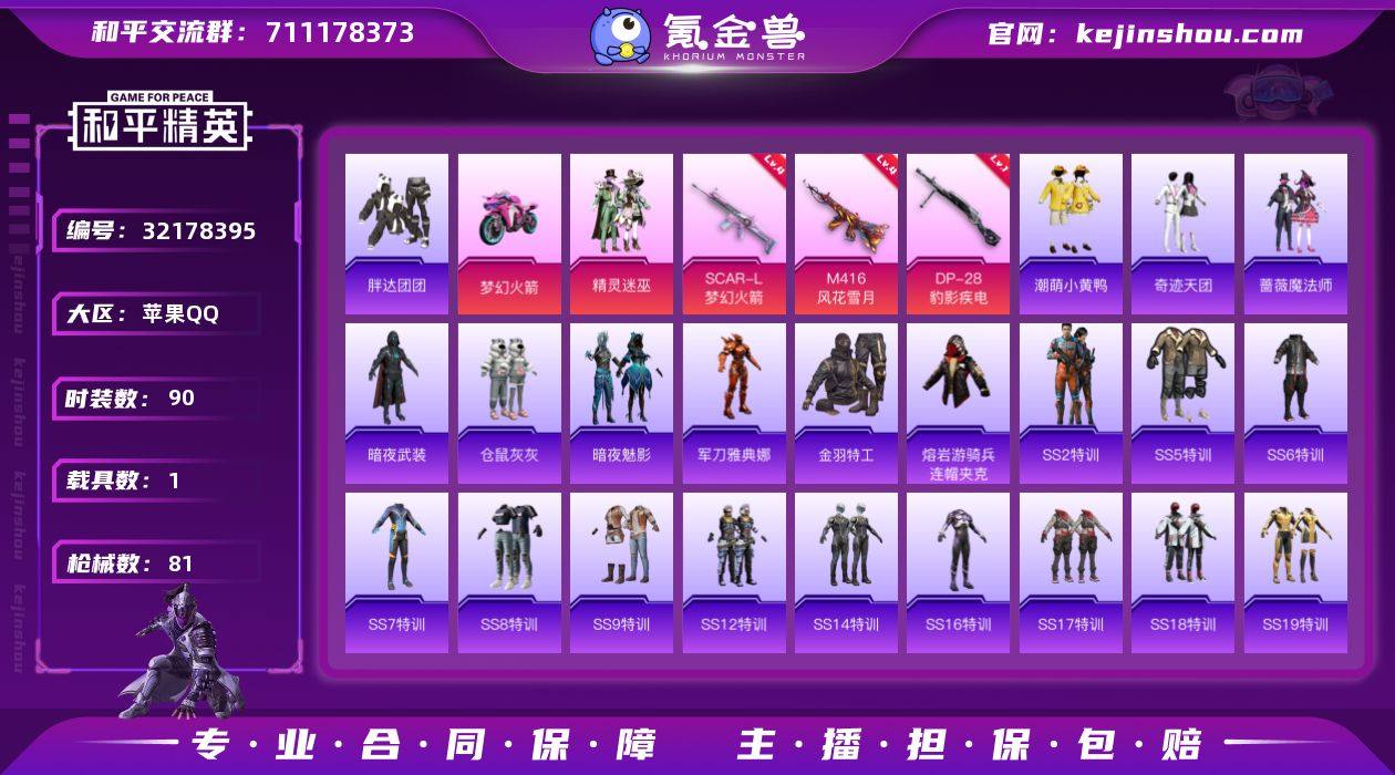 【AZH3047】苹果 手Q【无敌战神框 胖达团团潮萌小黄鸭 粉熊背包 1载具】无敌战神框-1粉装-4特效枪-1载具-2粉色飞行器-30278热力值-4王牌印记-90套装-81枪皮 【热门品类】:角色-军刀雅典娜,套装-胖达团团,套装-金羽特工,套装-潮萌小黄鸭,熔岩游骑兵连帽夹克 【粉色套装】:粉装-精灵迷巫 【粉色枪皮等级】:SCAR-L-梦幻火箭(四级),M416-风花雪月(四级),Mk14-福马献瑞(二级),DP-28-豹影疾电(一级) 【粉色载具】:双人摩托-梦幻火箭 【粉色枪皮】:SCAR-L-梦幻火箭,M416-风花雪月,Mk14-福马献瑞,DP-28-豹影疾电 【粉色飞行器】:精灵迷巫飞行器,梦幻火箭飞行器 【粉色降落伞】:精灵迷巫降落伞,梦幻火箭降落伞,暗夜玫瑰降落伞,炫光之旅降落伞 【稀有枪皮】:AKM-生命誓言,AKM-虎虎生威,AKM-霓虹街区,AKM-龙的传人,M16A4-生命誓言,M16A4-魔法学院,SCAR-L-生命誓言,M416-糯团青竹,M416-蓝色火焰,M416-魔法学院,GROZA-暗夜武装,GROZA-黑色刀锋,AUG-魔法学院,M762-拳皇97,M762-牛气冲天,M762-瑞龙福将,G36C-暗夜玫瑰,蜜獾-娇憨猪猪,UZI-娇憨猪猪,UZI-炫彩节奏,UZI-生命誓言,UZI-魔法学院,UMP45-蓝色火焰,Vector-生命誓言,Vector-黑色刀锋,汤姆逊-奇异狩猎者,汤姆逊-暗夜鎏金,Kar98K-梦幻火箭,Kar98K-炫彩节奏,Kar98K-红色方程式,M24-奇异狩猎者,AWM-恐龙拽拽,SKS-夜灯,SKS-炫彩节奏,VSS-华贵君王,VSS-黑色刀锋,Mini14-春暖花开,Mini14-梦幻火箭,Mini14-炫彩节奏,Win94-瑞龙福将,S686-魔法学院,S12K-瑞龙福将,S12K-娇憨猪猪,M249-彩虹符号,M249-拳皇97,MG3-幻世战舞者,MG3-瑞龙福将,P92-拳皇97,爆炸猎弓-喜羊羊与灰太狼 【其他套装】:套装-SS2特训,套装-SS5特训,套装-SS6特训,套装-SS7特训,套装-SS8特训,套装-SS9特训,套装-SS12特训,套装-SS14特...