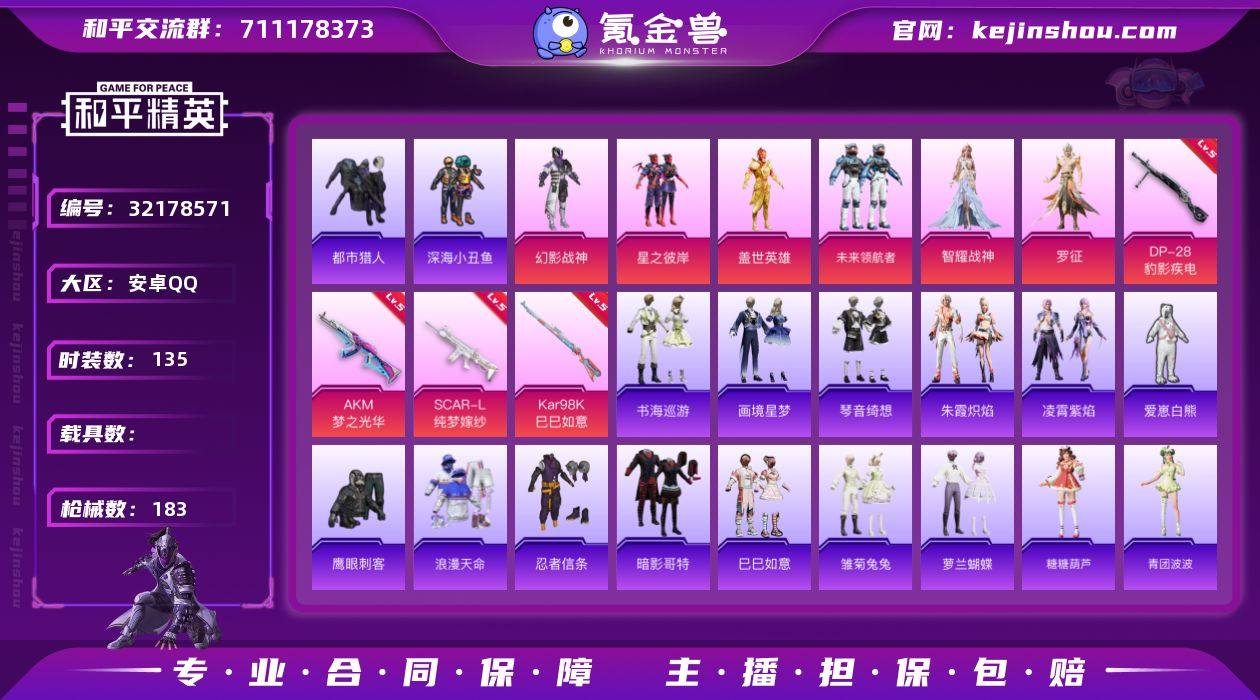 【kyhp901】安卓 手Q-7粉装-7特效枪-0载具-2粉色飞行器-52706热力值-1王牌印记-135套装-183枪皮 【热门品类】:套装-浪漫天命,套装-都市猎人,套装-深海小丑鱼,套装-忍者信条,套装-暗影哥特 【粉色套装】:粉装-幻影战神,粉装-星之彼岸,粉装-盖世英雄,粉装-未来领航者,角色-智耀战神,角色-罗征,角色-月中灵 【粉色枪皮等级】:AKM-梦之光华(五级),SCAR-L-纯梦嫁纱(五级),UMP45-萌骑冒险(三级),AKS-74U-森灵之息(四级),Kar98K-巳巳如意(五级),Mk14-福马献瑞(五级),DP-28-豹影疾电(五级) 【粉色枪皮】:AKM-梦之光华,SCAR-L-纯梦嫁纱,UMP45-萌骑冒险,AKS-74U-森灵之息,Kar98K-巳巳如意,Mk14-福马献瑞,DP-28-豹影疾电 【粉色飞行器】:炫彩糖果飞行器,宁雨蝶飞行器 【粉色降落伞】:幻影战神降落伞,暗夜鎏金降落伞,第五大道降落伞,忍者神龟降落伞,千金淑猫降落伞,月影灵韵降落伞,智耀战神降落伞,双重狂想降落伞,冷漠罗丽降落伞,极意拳锋降落伞,炫彩糖果降落伞 【稀有套装】:套装-巳巳如意,套装-炫彩糖果,套装-马上有钱,套装-雏菊兔兔,套装-萝兰蝴蝶,套装-糖糖葫芦,套装-青团波波,角色-都市丽猫,角色-俏兔智灵,角色-光矢逐梦,套装-燕燕于飞,套装-鱼渊荷华,套装-粉恋花,套装-紫幽梦,套装-蓝冰羽,角色-瑰梦爱神,套装-星影赞美诗,套装-彩虹兔,套装-云朵鹅,套装-雪绒豹,套装-混沌火种,角色-灵公主,套装-朱霞炽焰,套装-凌霄紫焰,套装-书海巡游,套装-画境星梦,套装-琴音绮想,套装-雨过天青,套装-红釉青花 【稀有枪皮】:AUG-冰晶雪宝,AKM-彩虹符号,AKM-影袭,AKM-破晓战魂,AKM-玄冥寒域,M16A4-红色方程式,SCAR-L-夜灯,SCAR-L-炫彩节奏,SCAR-L-红色方程式,M416-糯团青竹,M416-红色方程式,M416-蓝色火焰,M416-萌萌史莱姆,GROZA-影袭,GROZA-田园牧...
