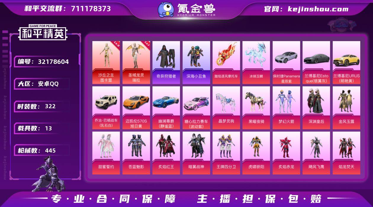 【特价出售/店主推荐】安卓 手Q-3神装-28粉装-24特效枪-13载具-22粉色飞行器-177368热力值-18王牌印记-322套装-445枪皮 【红色神装等级】:天马神君-驭风(一级),圣域龙灵-瑞拉(一级),沙丘之主-图卡盟(三级) 【红色角色神装】:天马神君-驭风,圣域龙灵-瑞拉,沙丘之主-图卡盟 【热门品类】:粉装-梦幻火箭,套装-深海小丑鱼,套装-奇异狩猎者,角色-军刀雅典娜,套装-金羽特工,角色-2P战斗服款,套装-龟仙人,角色-Mark.06 【粉色套装】:粉装-深渊皇后,粉装-梦幻火箭,粉装-金风玉露,粉装-甜蜜誓约,粉装-苍蓝魅影,粉装-炙焰红王,粉装-暗翼战神,粉装-王牌四分卫,粉装-虎啸骄阳,粉装-炙焰赤龙,粉装-飓风飞鹰,粉装-焰龙焚天,粉装-银龙傲海,粉装-骨龙祭渊,粉装-蓝莓炮弹,粉装-青葱仙萝,粉装-恐龙拽拽,角色-复仇流浪者,角色-呆萌星弥,角色-小可学妹,角色-圣堂之誓,角色-烟云彩露,角色-千金淑猫,角色-月影灵韵,角色-圣辉之星,粉装-星穹咏叹调,角色-罪夜之冕,角色-谜鸦审判 【粉色枪皮等级】:AKM-暮色玫影(三级),SCAR-L-纯梦嫁纱(七级),SCAR-L-魔童闹海 哪吒(三级),M416-心之恋语(七级),M416-风花雪月(二级),M416-灵猫魔法师(三级),GROZA-镜光...