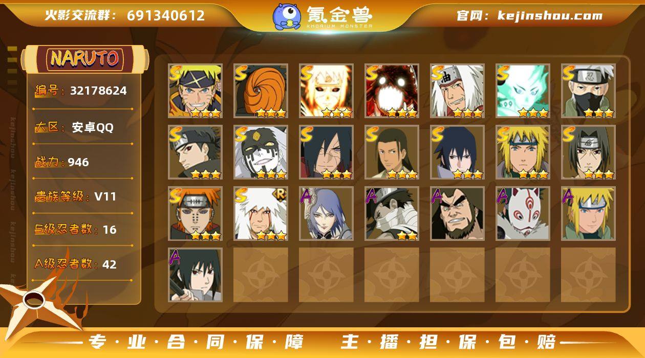 【火影忍者】战斗力:946W+;段位:上忍3阶;本服排名:400;VIP:V11级;S忍:16个;A忍:42个;通灵兽:17个,S忍:秽土转生解宇智波斑|须佐能乎旗木卡卡西|九喇嘛连结波风水门|五影会谈宇智波斑|天道佩恩|传说中的三忍自来也|漩涡鸣人宇智波佐助|须佐能乎宇智波止水|永恒万花筒宇智波佐助|最终章大筒木舍人|木叶创立千手柱间|舞之豪杰自来也|波风水门|须佐能乎宇智波鼬|大筒木桃式|暴怒第六尾漩涡鸣人__A忍:青春爆炸迈特凯|漂泊浪客宇智波带土|仙人模式巳月|侠隐江湖宇智波佐助|侠隐江湖药师兜|忍界大战李洛克|秽土转生角都|忍界大战日向宁次|木叶上忍猿飞木叶丸|火之意志继承者卑留呼|青年长门|忍者之路神秘面具男|志村团藏|青年波风水门|近松十人卫千代|须佐能乎宇智波佐助|晓大蛇丸|百豪春野樱|忍界大战秋道丁次|五代目雷影达鲁伊|黑绝|死司凭血飞段|疾风传我爱罗|飞段(普通) * 3星|神驹佑将小南|万花筒写轮眼旗木卡卡西|迈特凯(普通) * 5星|宇智波鼬(普通)|夏日限定宇智波鼬|干柿鬼鲛(普通) * 5星|秽土转生桃地再不斩|绯流琥蝎|蝎(普通)|猿飞阿斯玛(普通) * 5星|桃式显现漩涡博人|六代目水影长十郎|不动|宇智波泉奈|羁绊神农|忍界大战土台|初始形态机械鸣人|侠隐江湖大野木__通灵兽:忍犬(普通)|砂之守鹤|蓝蛇|蛤蟆吉|忍龟|镰鼬|猿魔|山椒鱼|蛞蝓(普通)|蜃|蛤蟆仙人|鲛鲨|蛤蟆健|乌鸦(普通)|蛤蟆龙|蛤蟆广|乌鸦夏日限定