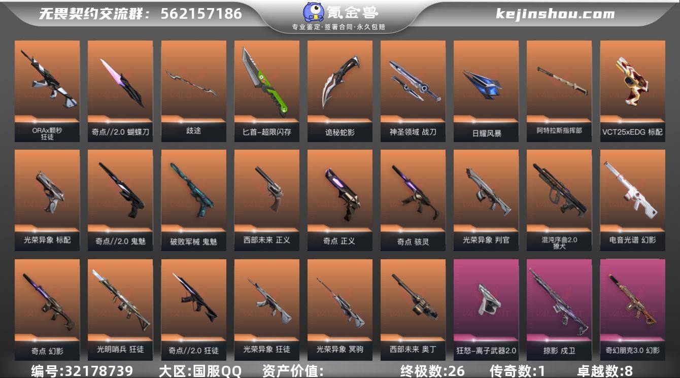 【5w库存紫金爪.奇点蝴蝶刀.电工钳.歧途.七狂徒五幻影光明哨兵.光荣异象.颗秒.紫金.光谱.离子幻影】YXy5790【可二次】【因赛季更新游戏段付以上号为准!】 【套装】:光荣异象套装,奇点//2.0套装,回火礼包:奇点套装 【英雄】:幻棱,炼狱,维斯,暮蝶,钛狐,壹决,铁臂,捷风,雷兹,幽影,不死鸟,贤者,猎枭,蝰蛇,零,芮娜,奇乐,尚勃勒,霓虹,斯凯,夜露,星礈,K/O,海神,盖可,黑梦,钢锁 【近战武器】:近战武器-碎心裂刃,近战武器-魔术火花,近战武器-光荣异象 歧途,近战武器-奇点//2.0 蝴蝶刀,近战武器-紫金爪刀,近战武器-超限闪存 匕首,近战武器-诡秘蛇影 军刀,近战武器-神圣领域 战刀,近战武器-日耀风暴 遗器,近战武器-阿特拉斯指挥部 甩棍,近战武器-魔术火花 【狂徒】:狂徒-光明哨兵,狂徒-奇点//2.0,狂徒-光荣异象,狂徒-ORA x 颗秒,狂徒-紫阙金琅,狂徒-离子武器//2.0,狂徒-奇幻朋克//3.0,狂徒-诡秘蛇影,狂徒-神罚//2.0 【幻影】:幻影-奇点,幻影-电音光谱,幻影-离子武器,幻影-紫阙金琅//2.0,幻影-奇幻朋克//3.0,幻影-超限闪存,幻影-神圣领域,幻影-末日之翼,幻影-电音光谱 【戍卫】:戍卫-掠影,戍卫-浮光跃金,戍卫-月球哨兵,戍卫-折光棱晶 【獠犬】:獠犬-混沌序曲//2.0,獠犬-神圣领域,獠犬-模拟赫兹 【冥驹】:冥驹-光荣异象,冥驹-模拟赫兹,冥驹-星云暗涌 【飞将】:飞将-末日之翼 【莽侠】:莽侠-超限闪存,莽侠-诡秘蛇影,莽侠-月球哨兵 【战神】:战神-神圣领域,战神-浮光跃金 【奥丁】:奥丁-西部未来,奥丁-末日之翼 【判官】:判官-光荣异象,判官-诡秘蛇影 【雄鹿】:雄鹿-模拟赫兹,雄鹿-月球哨兵 【骇灵】:骇灵-奇点,骇灵-浮光跃金,骇灵-星云暗涌 【蜂刺】:蜂刺-超限闪存,蜂刺-星云暗涌,蜂刺-折光棱晶 【标配】:标配-光荣异象,标配-超能偶...