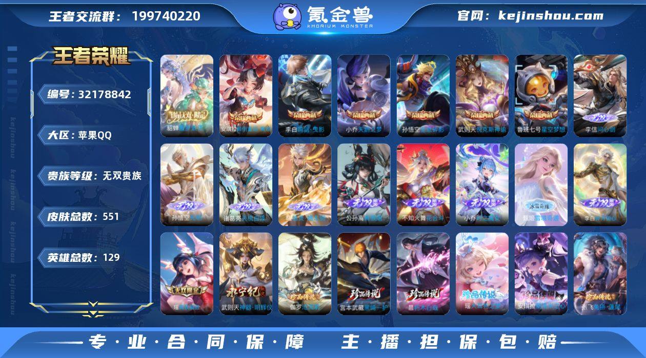 【LX41491】苹果Q-V11-129英雄-551皮肤-6典藏皮肤-1典藏英雄-1珍品无双-11无双-10珍品传说-84传说-175史诗-4星传说-3传说天幕-1精品灵宝 【英雄全皮】:廉颇全皮,嬴政全皮,刘禅全皮,李白全皮,司马懿全皮,孙权全皮,不知火舞全皮,苏烈全皮,梦奇全皮,李信全皮,嫦娥全皮,大司命全皮,敖隐全皮,曜全皮,蒙恬全皮,夏洛特全皮,司空震全皮,金蝉全皮,暃全皮,戈娅全皮,空空儿全皮,影全皮,海诺全皮,少司缘全皮 【荣耀典藏】:武则天英雄,孙悟空全息碎影,武则天倪克斯神谕,小乔天鹅之梦,鲁班七号星空梦想,李白鸣剑曳影,安琪拉颠倒童话魔镜 【珍品无双】:貂蝉馥梦繁花 【无双皮肤】:李信问心剑,孙悟空无相,诸葛亮天机白泽,曜器灵螭龙剑,甄姬雪境奇遇,公孙离离恨烟,不知火舞花合斗,小乔时之魔女,李白碎月剑心,瑶真我赫兹,武则天神器明辉仪 【珍品传说】:伽罗沧流箭,宫本武藏黑崎一护,暃朽木白哉,安琪拉酷洛米之心,瑶大耳狗之梦,张飞兔狲蓬尾,嫦娥器灵落星盏,孙策时之奇旅,鲁班七号江户川柯南,马可波罗怪盗基德 【传说皮肤】:云缨神骥越千峰,关羽神骥镇沧海,朵莉亚神骥鸣幻洲,狄仁杰神骥赴朔漠,貂蝉神骥聚万邦,马超神骥逐星野,花木兰异界灵契,王昭君长夜焕生,杨戬纵目迁山,后羿神树通天,大司命死亡执政官,司马懿九山相柳,杨玉环星之鸣奏,后羿千劫归真,司空震愿照山河定,女娲愿照千秋盛,妲己愿照众生和,澜愿照九州拓,蔡文姬愿照福禄聚,虞姬愿照岁时盈,云缨幻光神枪,嬴政玄雷天君,王昭君映山客,桑启鸣野蒿,夏侯惇霜北刀,铠冥王哈迪斯,朵莉亚心动手记,海月金乌负日,亚连落雪白狼,孙策乘龙淬吴钩,赵云乘龙铭钟鼎,艾琳觅芳踪,狄仁杰夜礼服假面,王昭君永恒水手月亮,甄姬至美化雀舞,大乔时之奇旅,兰陵王影龙天霄,吕布遇见神鼓,马可波罗...