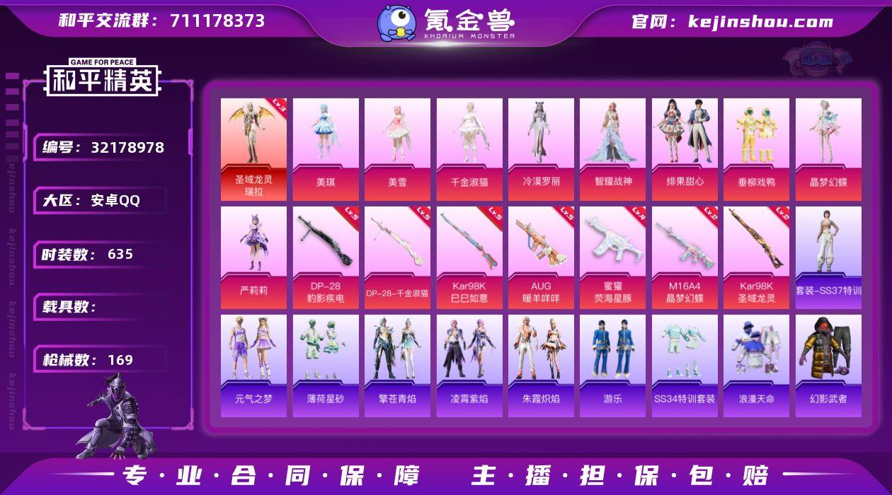 实名:可二次实名 是否支持人脸包赔:不支持 粉装数量:9 特效枪数量:7 时装数:635 枪械数:169 三级圣域龙灵-瑞拉 垂柳戏鸭,绯果甜心,晶梦幻蝶,冷漠罗丽,美琪,美雪,千金淑猫,严莉莉,智耀战神 五级DP-28-豹影疾电,五级AUG-暖羊咩咩,五级DP-28-千金淑猫,五级Kar98K-巳巳如意,四级蜜獾-荧海星豚,二级Kar98K-圣域龙灵,二级M16A4-晶梦幻蝶 SS37特训,元气之梦,薄荷星砂,凌霄紫焰,擎苍青焰,SS34特训套装,游乐,朱霞炽焰,缤纷果语,北国孤狼,白光莹,白色伏地魔,贝斯之夜,白熊同盟,冰原使者,纯白舞曲,春光漫游,彩虹兔,雏菊兔兔,长空猛禽,传奇侦探,炽焰拳师,纯真浪花,顶瓜瓜,大橘大利,都市魅力,风玲,绯红恋人,疯狂小兔子,粉恋花,果冻柠檬,格斗专家,光矢逐梦,光之冒险,湖蓝色名流,黑色伏地魔,黄色伏地魔,黄色名流,黄色运动,红色运动,航行童话,黑夜传说,幻影武者,鲛海歌灵,晶辉守护,酒红色名流,惊鸿侠骨,橘黑制服,竞技达人朋克,竞技名士,竞技勇士朋克,吉莉礼服,晶灵使者,极速光影,极速红龙,街头潮人,街头风暴,锦衣飞扬,绛羽幽主,空岛之星,快闪甜心,蓝冰羽,蓝彩潮人,龙的传人,凛冬战士,灵公主,猎鹰,萝兰蝴蝶,浪漫天命,蓝色运动,莱茵河畔,恋语绒绒,冷焰舞者,猎影月神,摩登魅猫,摩登天骄,猛禽,魅力单车,蜜露汐语,曼妙人鱼,萌萌史莱姆,墨青刃影,卖崽青蛙,霓虹街区,柠萌假日,牛气满满,破蛋小黄鸡,破晓战魂,青春校园,情公主,绮丽涂鸦,青年教官,青涩时光,骑行爱好者,青玉碎影,云朵鹅,糯粉咩咩,热情海星,人气偶像,燃烧卡路里,圣诞大吉,深蓝色名流,神秘领域,圣穹绘梦,SS25特训,SS26特训,SS27特训,SS28特训,SS29特训,SS30特训套装,SS31特训套装,SS32特训套装,SS33特训套装,SS5特训,SS6特训,巳巳如意,时尚圣诞,石蕴玉辉,甜蜜告白,糖霜甜心,兔兔白日梦,特训学院,听雨铃兰,完美偶像,星光纪元,小鸟芋圆,雪绒豹,雪山精英,雪山征服者,星途旅人,星渊小夜曲,跃动心情,耀粉歌者,阳光火鸡,银尘,迎夏光舞,鱼渊荷华,银月精灵,燕燕于飞,异域银装,战地督导,智慧之神,智谋强哥,紫幽梦,灼焰舞者 绯果甜心飞行器,公主华盖飞行器,鸢尾晶梦飞行器,巴啦啦小魔仙降落伞,第五大道降落伞,绯果甜心降落伞,鬼刀降落伞,幻彩电音降落伞,精灵梦叶罗丽降落伞,晶梦幻蝶降落伞,冷漠罗丽降落伞,莲影清波降落伞,千金淑猫降落伞,圣域龙灵降落伞,荧海星豚降落伞,智耀战神降落伞 卖家说:基本上有的粉装和红装的飞行器头盔都有,王者有贵六连体号,有貂蝉两个限定传说皮,还有一个仲夏夜之梦加星元,瑶情人节限定皮肤,大乔情人节传说限定皮肤,公孙离西游记皮肤,妲己时之彼岸等等