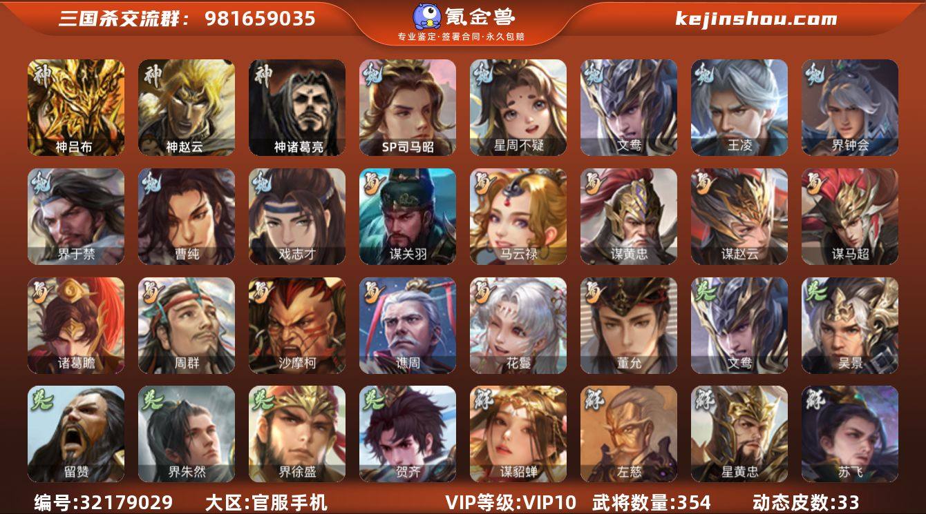 【1765】官阶:大将军;VIP等级:VIP10;史诗武将数量:38;动态皮肤数量:33;武将总数:354;史诗宝珠数量:0;将魂数量:8200;神将:5;魏国史诗武将:22;蜀国史诗武将:11;吴国史诗武将:5;群史诗武将:11 神吕布,神赵云,神吕蒙,神周瑜,神诸葛亮,SP司马昭,星周不疑,文鸯,王凌,界钟会,界于禁,曹纯,戏志才,马云騄,谋黄忠,谋赵云,谋马超,诸葛瞻,周群,沙摩柯,谯周,花鬘,董允,谋关羽,吴景,留赞,界朱然,界徐盛,贺齐,谋貂蝉,左慈,星黄忠,苏飞,审配,麹义,南华老仙,沮授,界李儒,杜预,张绣,神刘备-龙兴海内,神甘宁-万人辟易(动态),神周瑜-陵光引灵(动态),神诸葛亮-孟章诛邪(动态),星周不疑-才广志宏(动态),钟会-潜蛟觊天(动态),曹丕-气荡山河(动态),星周不疑-龙年清明(动态),甄姬-明珠耀躯(动态),SP蔡文姬-兔年冬日(动态),荀彧-驱虎吞狼(动态),张春华-牛年立冬(动态),曹真-虎年春节(动态),曹纯-虎年春节(动态),曹纯-长坂败备(动态),刘备-龙御天下(动态),卧龙诸葛-龙跃凤鸣(动态),费祎-安民护祚(动态),黄忠-明良千古(动态),关索-鼠年中秋(动态),李丰-太仓聚粟(动态),孙策-兔年清明(动态),周处-义除三害(动态),孙权-永开吴祚(动态),孙策-虎踞江东(动态),周瑜-免年清明(动态),孙策-猪年七夕(动态),小乔-鼠年春分(动态),界孙策-猪年七夕(动态),凌统-长风破浪(动态),界凌统-长风破浪(动态),刘赞-灵魂歌王(动态),文鸯-势若万钧(动态),蔡夫人-计上心来(动态),灵雎-霜刃绚练(动态),袁绍-声震寰宇(动态),李儒-鸠杀少帝(动态),界李儒-鸠杀少帝(动态),张鲁-虎年冬至(动态)