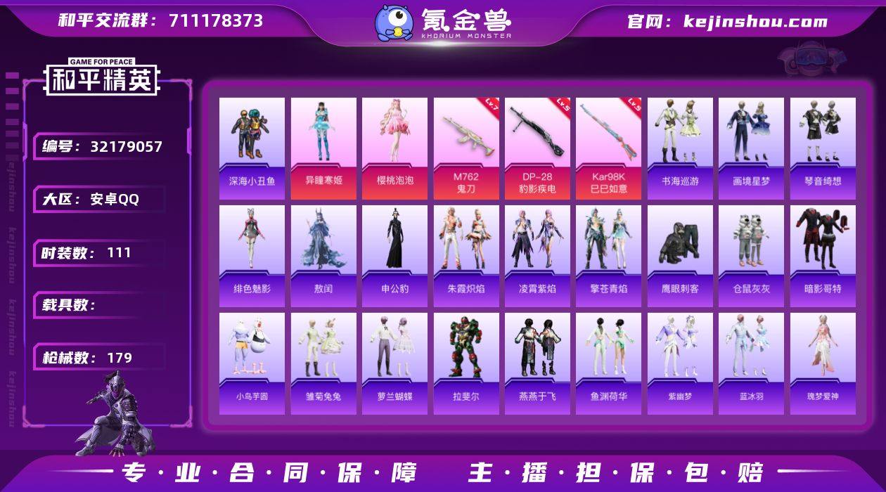 安卓 手Q-2粉装-6特效枪-0载具-1粉色飞行器-47902热力值-7王牌印记-111套装-179枪皮 【热门品类】:套装-深海小丑鱼,套装-暗影哥特 【粉色套装】:角色-樱桃泡泡,角色-异瞳寒姬 【粉色枪皮等级】:M762-鬼刀(七级),ACE32-萌骑漫游(二级),AKS-74U-森灵之息(五级),Kar98K-巳巳如意(五级),Mk14-福马献瑞(五级),DP-28-豹影疾电(五级) 【粉色枪皮】:M762-鬼刀,ACE32-萌骑漫游,AKS-74U-森灵之息,Kar98K-巳巳如意,Mk14-福马献瑞,DP-28-豹影疾电 【粉色飞行器】:炫彩糖果飞行器 【粉色降落伞】:镜光幻境降落伞,精灵梦叶罗丽降落伞,金丰海韵降落伞,未来领航者降落伞,千金淑猫降落伞,鬼刀降落伞,雪月幻音降落伞,冷漠罗丽降落伞,宁雨蝶降落伞,异瞳寒姬降落伞,炫彩糖果降落伞 【稀有套装】:套装-小鸟芋圆,套装-雪国风尚,套装-炫彩糖果,角色-魂电,套装-马上来财,套装-雏菊兔兔,套装-萝兰蝴蝶,角色-拉斐尔,套装-燕燕于飞,套装-鱼渊荷华,套装-紫幽梦,套装-蓝冰羽,角色-瑰梦爱神,套装-云朵鹅,套装-雪绒豹,套装-蓝海鲸歌,套装-朱霞炽焰,套装-凌霄紫焰,套装-擎苍青焰,角色-敖闰,角色-申公豹,角色-绯色魅影,套装-书海巡游,套装-画境星梦,套装-琴音绮想,套装-雨过天青,套装-红釉青花,角色-唐三,角色-朱竹清 【稀有枪皮】:AKM-彩虹符号,AKM-影袭,AKM-星之彼岸,AKM-百万伏特,AKM-破晓战魂,M16A4-幻世战舞者,SCAR-L-炫彩节奏,SCAR-L-玉兔迎春,M416-糯团青竹,M416-红色方程式,GROZA-影袭,GROZA-田园牧歌,AUG-天降萌叽,AUG-耀粉歌者,M762-天降萌叽,M762-云朵鹅,G36C-星穹咏叹调,蜜獾-天降萌叽,蜜獾-青瓷战姬,ACE32-画境星梦,ARX-凌霄紫焰,UZI-啾咪啾咪,UZI-天降萌叽,UZI-影袭,UZI-红色方程式,UMP45-炫光之旅,Vector-田园牧歌,MP5K-画境星梦,AKS-74U-极...