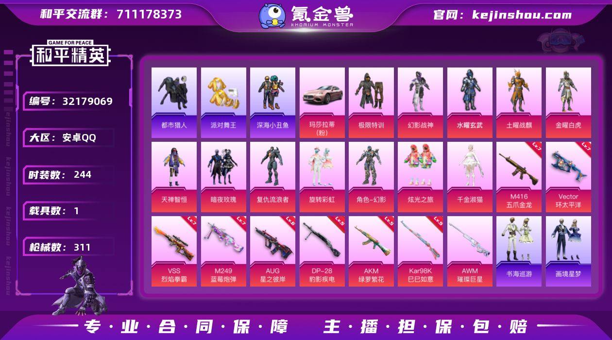 【特价出售/店主推荐】 安卓,手Q-12粉装-10特效枪-1载具-2粉色飞行器-101577热力值-15王牌印记-244套装-311枪皮 【热门品类】:套装-浪漫天命,套装-都市猎人,套装-派对舞王,套装-深海小丑鱼,套装-小丑鱼,套装-龟仙人,套装-暗影哥特 【粉色套装】:粉装-极限特训,粉装-幻影战神,粉装-水曜玄武,粉装-土曜战麒,粉装-金曜白虎,粉装-天禅智恒,粉装-暗夜玫瑰,角色-复仇流浪者,粉装-旋转彩虹,角色-幻影,粉装-炫光之旅,角色-千金淑猫 【粉色枪皮等级】:AKM-绿萝繁花(五级),M416-五爪金龙(七级),AUG-星之彼岸(六级),Vector-环太平洋(七级),Kar98K-巳巳如意(五级),VSS-烈焰拳霸(七级),Mk14-福马献瑞(五级),M249-蓝莓炮弹(七级),DP-28-豹影疾电(五级),PKM-萌骑夺宝(二级) 【粉色载具】:玛莎拉蒂Ghibli(粉) 【粉色枪皮】:AKM-绿萝繁花,M416-五爪金龙,AUG-星之彼岸,Vector-环太平洋,Kar98K-巳巳如意,VSS-烈焰拳霸,Mk14-福马献瑞,M249-蓝莓炮弹,DP-28-豹影疾电,PKM-萌骑夺宝,AWM-璀璨巨星 【粉色飞行器】:炫彩糖果飞行器,梦幻火箭飞行器 【粉色降落伞】:极限特训降落伞,幻影战神降落伞,甜心宝贝降落伞,梦幻火箭降落伞,星之彼岸降落伞,暗...