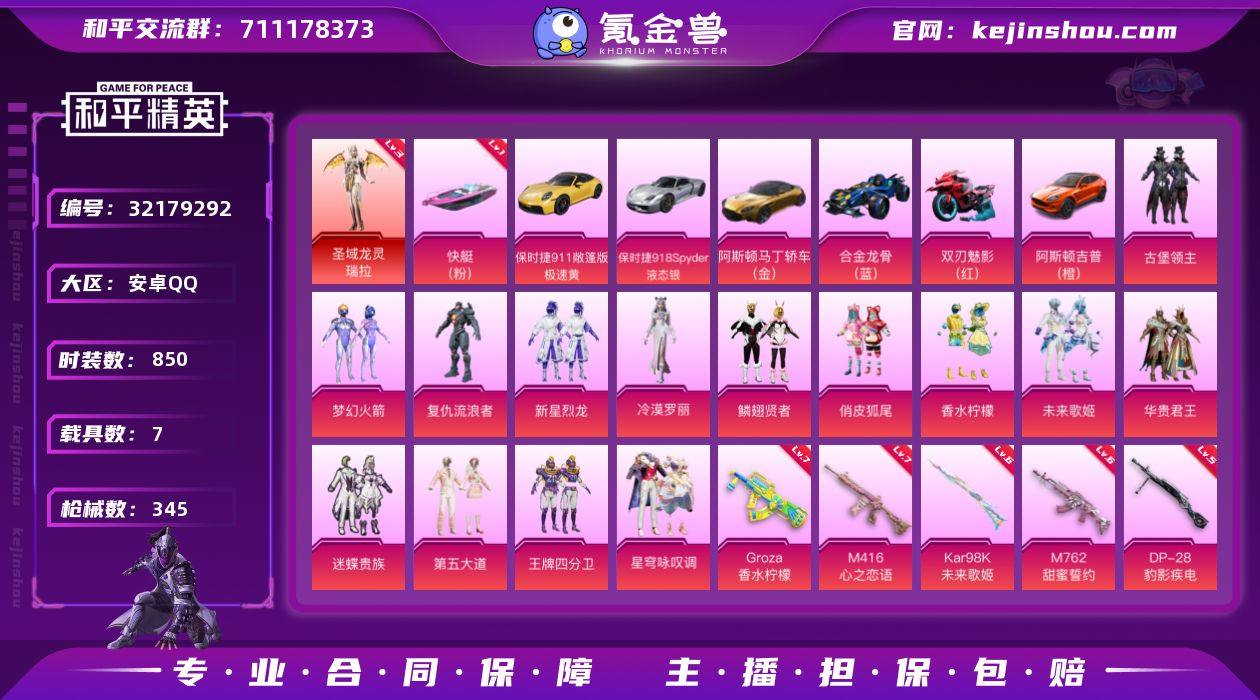 实名:不可二次实名 是否支持人脸包赔:支持 粉装数量:14 特效枪数量:15 载具数:7 时装数:850 枪械数:345 三级圣域龙灵-瑞拉 第五大道,复仇流浪者,古堡领主,华贵君王,鳞翅贤者,冷漠罗丽,迷蝶贵族,梦幻火箭,俏皮狐尾,未来歌姬,王牌四分卫,星穹咏叹调,香水柠檬,新星烈龙 七级Groza-香水柠檬,七级M416-心之恋语,六级Kar98K-未来歌姬,六级M762-甜蜜誓约,五级DP-28-豹影疾电,五级AKM-炫紫旋律,五级AMR-智耀战神,五级M24-星之信仰,五级MK14-甜梦熊击,五级SCAR-L-梦幻火箭,四级蜜獾-异瞳寒姬,四级MG-36-沧焰双生,三级Kar98K-圣域龙灵,一级MK14-福马献瑞,一级Kar98K-伏魔团 一级快艇-塞莎KL27(霓虹粉),保时捷911敞篷版(极速黄),保时捷918Spyder(液态银),阿斯顿·马丁DBS(金),阿斯顿·马丁DBX(橙),合金龙骨(蓝),双人摩托-双刃魅影(红) 狙击之神,福马献瑞,瑰石海星,SS37特训,青翼流星,SS36特训,炫彩糖果,粉黛兰香,萌鸡速递,SS35特训,元气之梦,美羊羊,喜羊羊,薄荷星砂,凌霄紫焰,擎苍青焰,SS34特训套装,朱霞炽焰,暗夜魅影,暗夜契约,冰川格斗者,冰川谧蓝,缤纷果语,暴风机械师,缤纷焰火,北国孤狼,薄荷蓝莓,壁垒格斗者,白色伏地魔,冰爽海盐,白熊同盟,白月香洋装,纯白誓言,彩虹兔,初火先锋,长空猛禽,丛林猎人,潮流先锋,潮流游乐家,潮萌小黄鸭,超能拳王,传奇侦探,春日漫步,炽焰拳师,顶瓜瓜,大橘大利,大橘为重,绯格组合,风华少年志,疯狂小兔子,粉恋花,粉日山川,风行保卫者,飞行日记,格斗专家,诡谋托雷基亚,诡面顽熊,龟仙人,光影梦想家,光之冒险,幻彩翩翩,鹤鸣,虎虎生威吉莉,红酒骑士,黑色刀锋,黄色伏地魔,灰色格斗者,海上生明月,黄色运动,红色运动,幻世战舞者,和煦暖阳,绝对偶像,金戈铁马,惊鸿侠骨,娇憨猪猪,竞技名士,竞技勇士朋克,吉莉礼服,静谧青瓷,坚韧舞者,精神漫游,金鼠迎春,机械英豪,机械征服者,军械专家,锦衣飞扬,酷潮明星,科技之星,空投萌叽,蓝冰羽,龙的传人,烈火街头,玲珑飞花,浪漫波比,黎明保卫者,猎梦纪元,灵蜜圈圈,浪漫樱花,镭射皇者,蓝色守护者,龙腾端午,蓝甜马卡龙,摩登艾咪,妙红点点,萌黄之夏,果汁能量,麻辣教官,懵萌河马,萌趣咩咩,萌趣颜团子,冥星暗影,迷域探索者,梦之呓语,逆风勇士,霓虹极客,霓虹街区,怒火燎原,霓虹热舞,柠萌假日,牛气冲天,牛气满满,青春冒险家,轻风白浪,拳皇97草薙京,奇迹天团,绮丽涂鸦,青丘仙客,青涩时光,骑行爱好者,清香五月粽,青玉碎影,云朵鹅,瑞龙福将,软嫩糖心蛋,燃烧卡路里,热血青春,韶华初心,闪金天王,深蓝冒险家,沙漠兵团,神秘领域,沙漠探路者,沙漠雄狮,神气柴柴,帅气教官,SS10特训,SS11特训,SS12特训,SS13特训,SS14特训,SS15特训,SS16特训,SS17特训,SS18特训,SS19特训,SS20特训,SS21特训,SS22特训,SS23特训,SS24特训,SS25特训,SS26特训,SS27特训,SS28特训,SS32特训套装,SS33特训套装,SS5特训,SS6特训,SS7特训,SS8特训,SS9特训,闪耀星光,太极红客,甜蜜熊情侣,涂山之恋,甜心亚梦,突袭者,团圆交子,田园牧歌,特战装甲,王牌教练,舞夜骑士,娴静芝兰,迅捷之星,炫蓝之夏,迅猛虎鲸,雪绒豹,夏日音浪,雪山精英,醒狮腾龙,核芯基因,香榭午后,虚音幻奏,星渊小夜曲,银白舞王,原初圣火,异