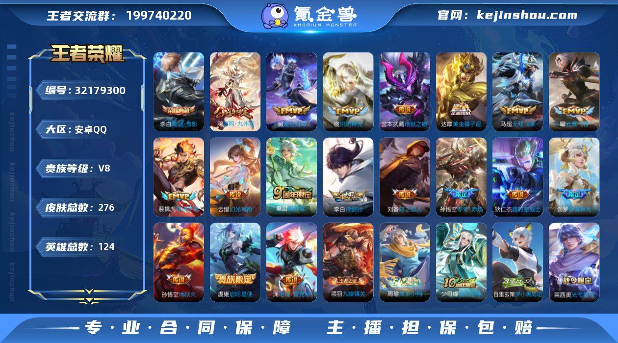 编号97807 可二次 v8 276皮肤 1典藏 18传说 2星传说(幽冥火 幽冥之眼)鸣剑·曳影 愿照·九州拓 零号·赤焰 炽翼辉光 谪仙醉月 器灵·浮梦炉 孙行者 飞衡 百木心枪 埋骨钱 祥瑞亨通 电玩·雷克斯 幻光神枪 云鹰飞将 诗剑行 逐花归海 启明星使 地狱火 地狱之眼 炽阳神光 狄仁杰-超时空战士 时之恋人(男) 鸣野蒿 无双飞将 黄金狮子座 逐霄战戟 决胜骁骑 逐浪之夏 刘备-百相守