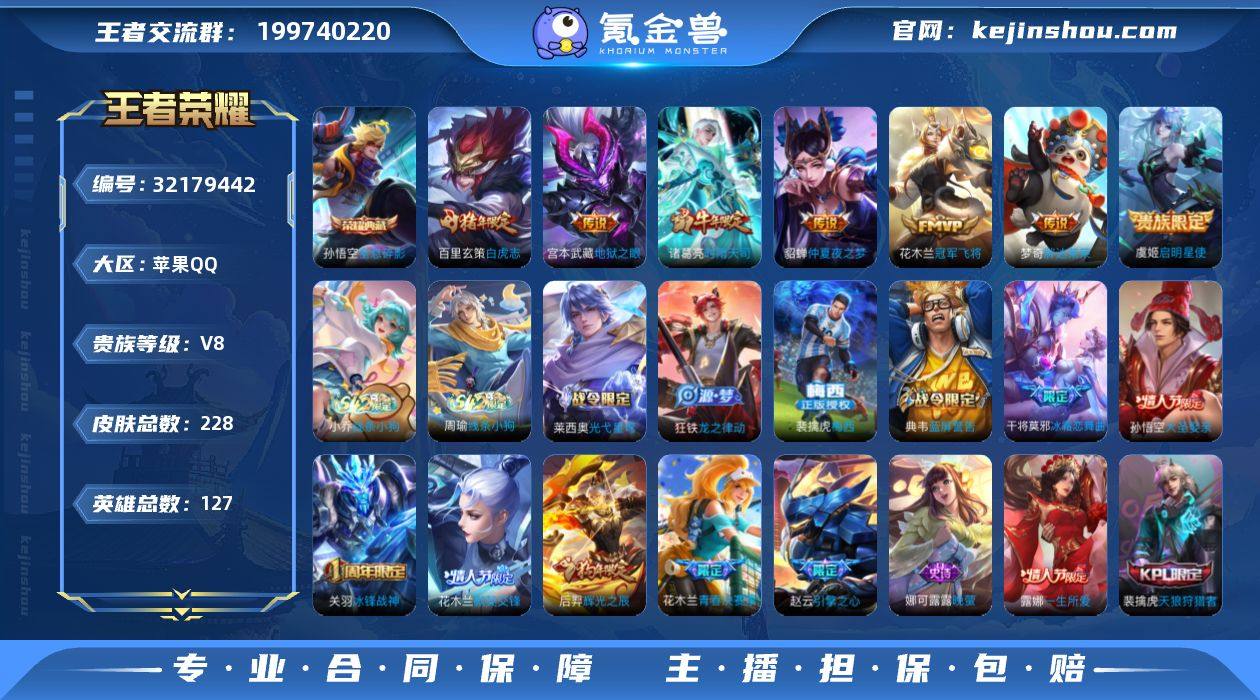 贵族等级:V8 典藏皮肤数:1 珍品无双皮肤数:0 无双皮肤数:0 珍品传说皮肤数:0 传说皮肤数:7 史诗皮肤数:61 皮肤数:228 英雄数:127 段位:绝世王者 卖家说:梅西,水晶280