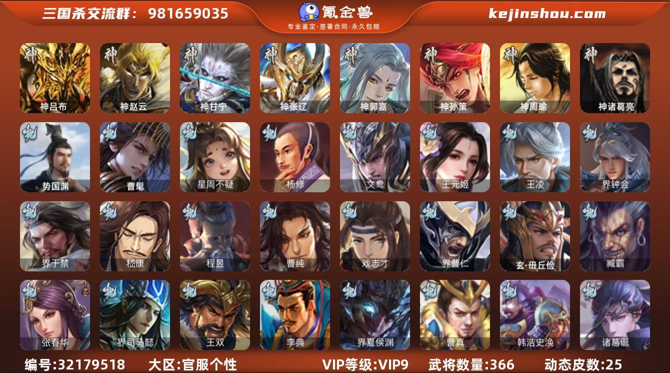 官阶:大将军;VIP等级:VIP9;史诗武将数量:44;动态皮肤数量:25;武将总数:366;史诗宝珠数量:0;将魂数量:1334;神将:7;魏国史诗武将:21;蜀国史诗武将:8;吴国史诗武将:7;群史诗武将:12