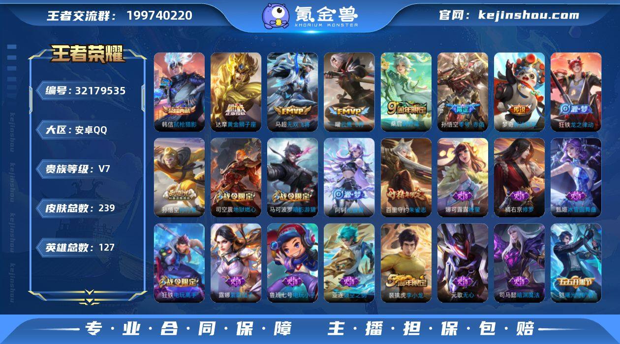 安卓Q-V7-最强王者段位-127英雄-239皮肤-1典藏皮肤-6传说-66史诗【英雄全皮】:空空儿全皮,影全皮【荣耀典藏】:韩信弑枪猎影【传说皮肤】:桑启鸣野蒿,马超无双飞将,孙悟空零号赤焰,曜云鹰飞将,达摩黄金狮子座,梦奇胖达荣荣【限定皮肤】:姜子牙天穹之誓,杨戬破阵退雄兵,狄仁杰阴阳师,赵云皇家上将,墨子降魔,孙尚香蔷薇恋人,庄周高山流水,高渐离玩趣恶龙,钟无艳超时空战士,扁鹊奇幻香踪,白起夜都怪侠,元歌无心,甄姬落雪兰心,马可波罗暗影游猎,狄仁杰魔术师,狄仁杰万华元夜,达摩沙漠行僧,项羽海滩派对,老夫子醍醐杖,程咬金演武夺筹,王昭君午后时光,兰陵王金庭之子,孙悟空零号赤焰,孙悟空孙行者,李元芳云中旅人,钟馗驱傩正仪,杨戬潮玩骑兵,鬼谷子原初探秘者,鬼谷子五谷丰年,苏烈千军破阵,百里守约朱雀志,沈梦溪大漠名商,明世隐吟游魔法,裴擒虎李小龙,裴擒虎擒涛扼浪,狂铁电玩高手,云中君纤云弄巧,上官婉儿梁祝,上官婉儿神器万象笔,嫦娥拒霜思,嫦娥暖冬兔眠,鲁班大师探海日志,桑启海盐诗旅,暃星界游侠,艾琳流音漫舞,司空震地狱燃心,阿古朵江河有灵,张良古海寻踪,蒙犽百解令,蒙恬荣光圣徽,高渐离燃音魔法,妲己灵卜魔法,鬼谷子天穹祈灯,沈梦溪龙舞盛年,刘邦剑破天穹,镜青焰无极,项羽苍威无极,刘备异域游侠,周瑜熔金海岸【年限皮肤】:百里守约朱雀志【赛季限定】:老夫子醍醐杖,鬼谷子原初探秘者,狄仁杰万华元夜,程咬金演武夺筹,钟馗驱傩正仪,苏烈千军破阵,达摩沙漠行僧,兰陵王金庭之子,沈梦溪大漠名商,李元芳云中旅人,桑启海盐诗旅,裴擒虎擒涛扼浪,鲁班大师探海日志,张良古海寻踪,鬼谷子天穹祈灯,刘邦剑破天穹,姜子牙天穹之誓,东皇太一噬灭天穹,太乙真人谧流熔炉,钟馗虚灵犬护,蒙恬荣光圣徽【战令限定】:马可波罗暗影游猎,明...