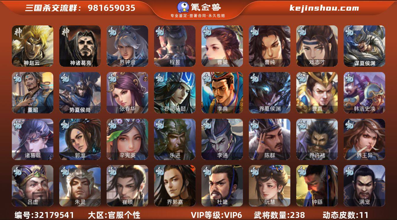 官阶:骠骑将军;VIP等级:VIP6;史诗武将数量:14;动态皮肤数量:11;武将总数:238;史诗宝珠数量:95;将魂数量:5279;神将:2;魏国史诗武将:2;蜀国史诗武将:2;吴国史诗武将:2;群史诗武将:4