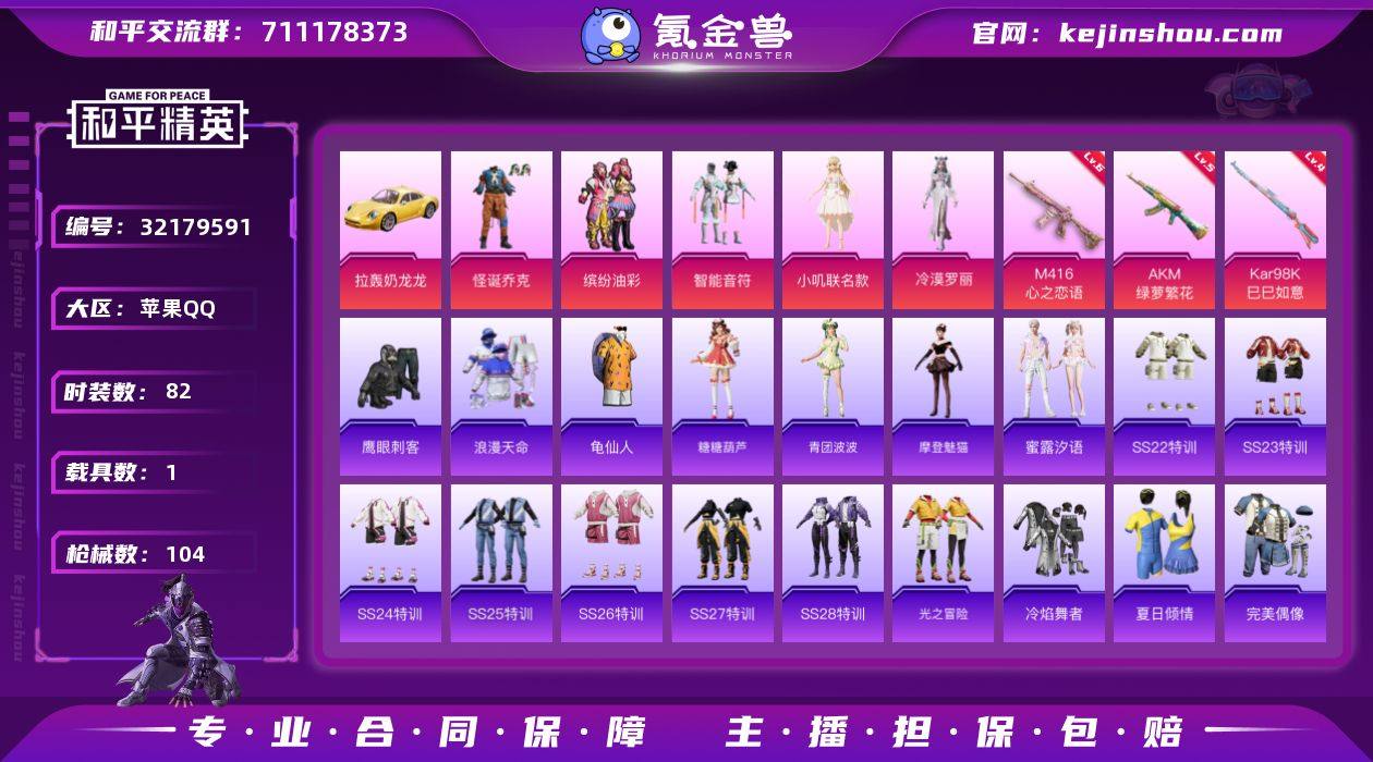 YZJ15644-可二次-苹果Q-1稀有1载具5粉装5特效枪3热门82套装104枪皮 31880热力值 极品精氪号 6级M4心之恋语 小丑 猪妹 智能音符 小叽联名款 焰鹰斗篷 情公主 4印记 历史超级王牌4星 【1稀有】 浪漫天命 【1载具】 拉轰奶龙龙 【5粉装】 小叽联名款 怪诞乔克 冷漠罗丽 智能音符 缤纷油彩 【5特效枪】 M416-心之恋语 (6级) AKM-绿萝繁花 (5级) Kar98K-巳巳如意 (4级) Mk14-福马献瑞 (3级) ACE32-萌骑漫游 (4级) 【3热门】 龟仙人 鹰眼刺客 漫步者 营地ID:951497994