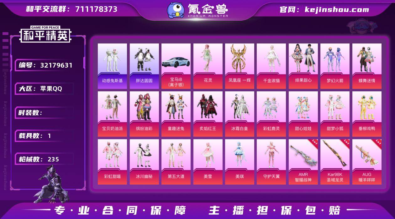 猪妹 小狐 番茄 猫鞋 胖达】 c26882-【可二次】【因赛季更新游戏段付以上号为准!】 苹果Q-1稀有1载具21粉装12特效枪11热门184套装235枪皮 8w热力值 18印记 历史绝世王牌15星 【1稀有】 浪漫天命 【1载具】 宝马i8(离子银) 【21粉装】 梦幻火箭 蝶舞迷情 美琪 美雪 凤凰座一辉 宝贝奶油派 千金淑猫 花灵 绯果甜心 守护天翼 垂柳戏鸭 缤纷油彩 第五大道 冰川幽秘 童趣迷兔 冰霜白皇 炙焰红王 甜梦小狐 彩虹甜喵 甜心娃娃 彩虹鹿灵 【12特效枪】 SCAR-L-锦绣绵绵 (5级) M416-心之恋语 (7级) AKM-绿萝繁花 (5级) Kar98K-圣域龙灵 (3级) Kar98K-巳巳如意 (5级) DP-28-豹影疾电 (5级) AUG-暖羊咩咩 (5级) UMP45-量子极限 (5级) AMR-智耀战神 (6级) GROZA-镜光银凌 (5级) M417-第五大道 (4级) M249-彩虹甜喵 (7级) 【11热门】 8号机 龟仙人 浪漫假日 红熊茄茄 动感兔斯基 潮萌小黄鸭 糯粉咩咩 激萌罗小黑 胖达圆圆 狂沙舞者 破蛋小黄鸡 【2头盔】 童趣迷兔头盔 梦幻火箭头盔 【1背包】 梦幻火箭背包 圣域龙宝僚机