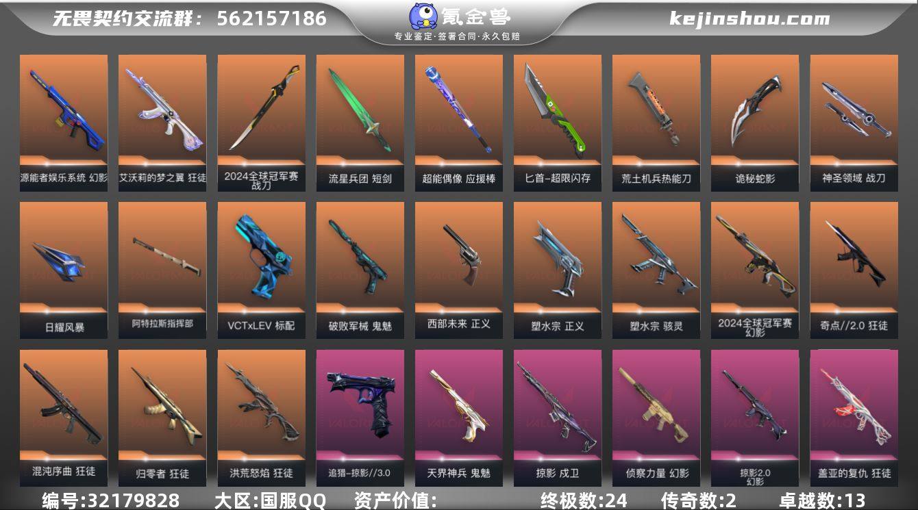 【套装】:2024全球冠军赛套装,回火礼包:掠影套装,掠影//3.0套装【英雄】:幻棱,炼狱,维斯,暮蝶,钛狐,壹决,铁臂,捷风,雷兹,幽影,不死鸟,贤者,猎枭,蝰蛇,零,芮娜,奇乐,尚勃勒,霓虹,斯凯,夜露,星礈,K/O,海神,盖可,黑梦,钢锁【近战武器】:近战武器-2024全球冠军赛 战刀,近战武器-影蝶,近战武器-影钩,近战武器-紫金爪刀,近战武器-鬼丸国纲,近战武器-流星兵团 短剑,近战武器-超能偶像 应援棒,近战武器-超限闪存 匕首,近战武器-荒土机兵 热能刀,近战武器-夜刃诡镰,近战武器-诡秘蛇影 军刀,近战武器-神圣领域 战刀,近战武器-日耀风暴 遗器,近战武器-阿特拉斯指挥部 甩棍【狂徒】:狂徒-归零者,狂徒-洪荒怒焰,狂徒-混沌序曲,狂徒-奇点//2.0,狂徒-艾沃莉的梦之翼,狂徒-掠影,狂徒-盖亚的复仇,狂徒-海洋之星,狂徒-日冕雄师,狂徒-紫阙金琅,狂徒-离子武器//2.0,狂徒-超能偶像,狂徒-荒土机兵,狂徒-流星兵团,狂徒-诡秘蛇影【幻影】:幻影-2024全球冠军赛,幻影-源能者娱乐系统,幻影-侦察力量,幻影-掠影//2.0,幻影-超限闪存,幻影-神圣领域,幻影-聚合之力,幻影-纳米打击,幻影-末日之翼【戍卫】:戍卫-掠影,戍卫-超能偶像,戍卫-浮光跃金,戍卫-逆冲蛮牛,戍卫-战术熊与伙伴们,戍卫-月球哨兵,戍卫-折光棱晶【獠犬】:獠犬-神圣领域,獠犬-采蜜小蜂队,獠犬-模拟赫兹,獠犬-逆冲蛮牛【冥驹】:冥驹-堕天遗武,冥驹-荒土机兵,冥驹-模拟赫兹,冥驹-星云暗涌【飞将】:飞将-聚合之力,飞将-战术熊与伙伴们,飞将-末日之翼【莽侠】:莽侠-超限闪存,莽侠-诡秘蛇影,莽侠-纤云弄巧,莽侠-月球哨兵【战神】:战神-神圣领域,战神-采蜜小蜂队,战神-浮光跃金【奥丁】:奥丁-掠影//2.0,奥丁-流星兵团,奥丁-纳米打击,奥丁-末日之翼【判官】:判官-超能偶像,判官-诡秘...
