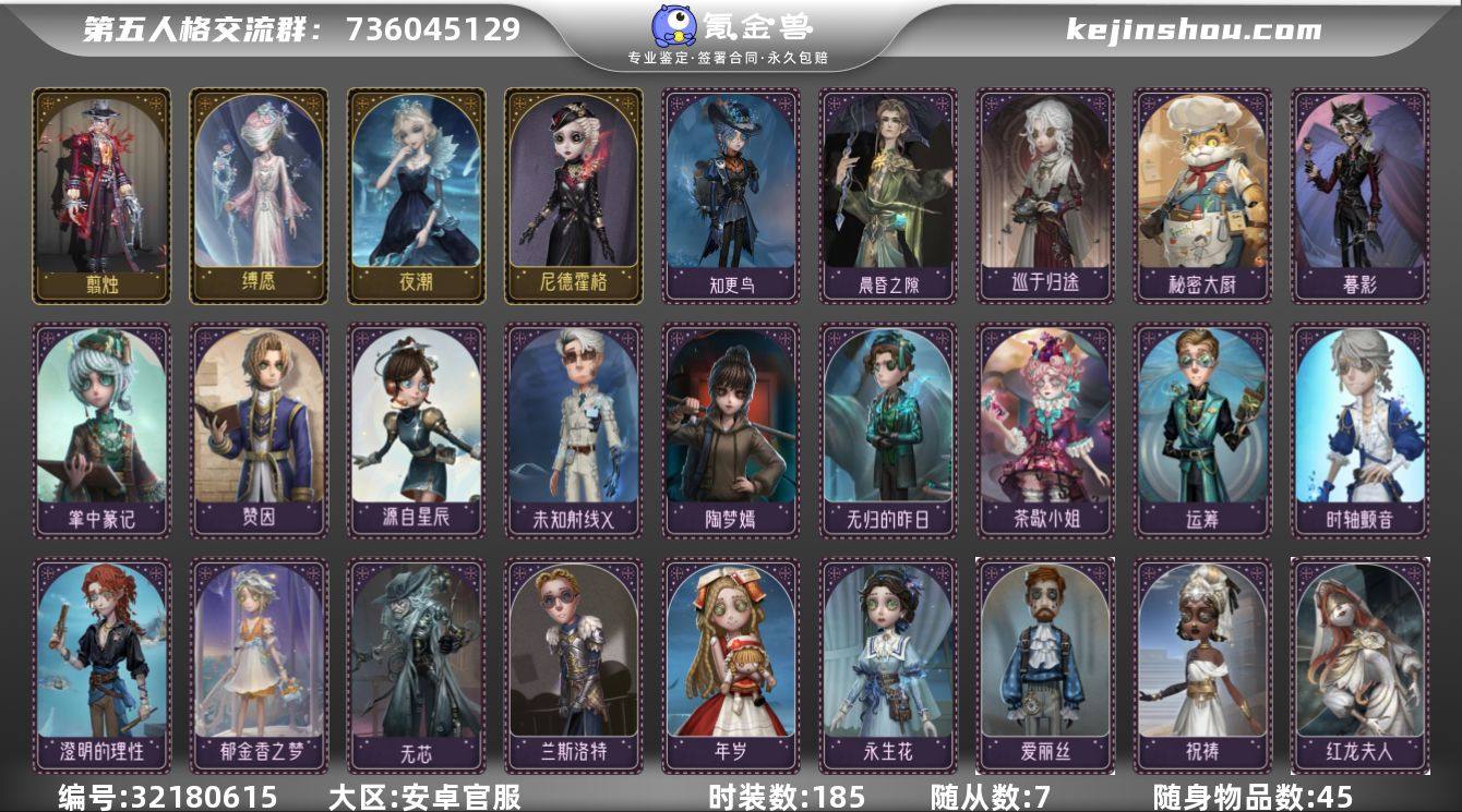 阅历等级:35 时装数:185 虚妄杰作时装数:0 稀世时装数:4 奇珍时装数:31 随从数:7 稀世随从数:0 奇珍随从数:0 随身物品数:45 虚妄杰作随身物品数:0 稀世随身物品数:3 奇珍随身物品数:9 角色数:23 杰克-翦烛,昆虫学者-缚愿,红夫人-夜潮,空军-尼德霍格 卖家说:一张角色解锁卡和两张紫皮解锁卡