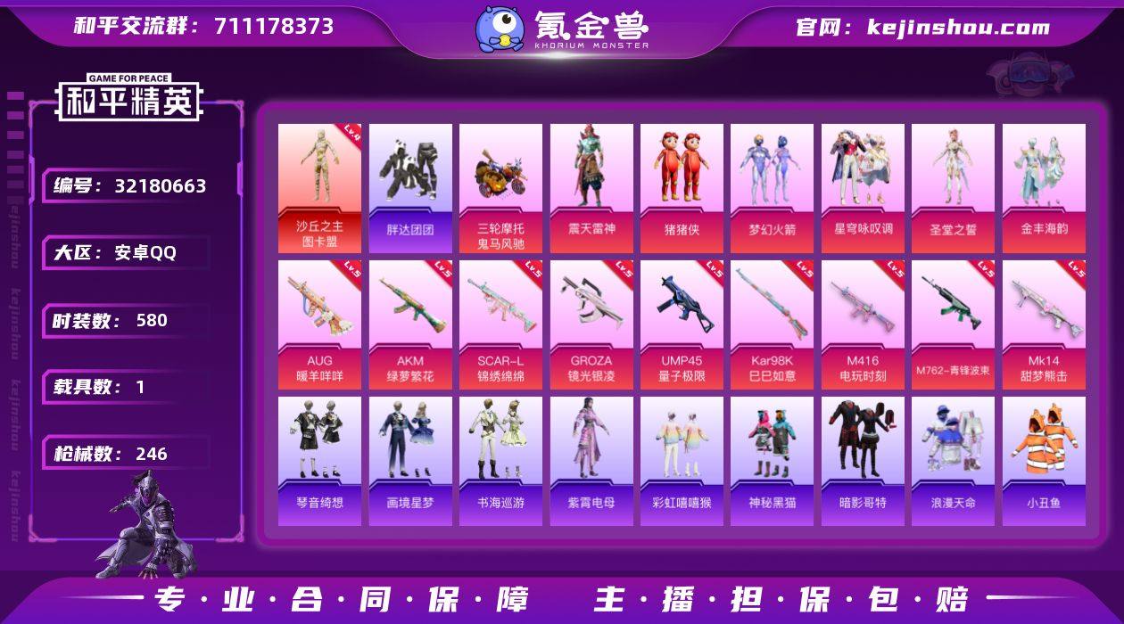 【特价出售】安卓Q-1红装3稀有1载具5粉装10特效枪13热门166套装246枪皮 80436热力值 17印记 历史传奇王牌13星 【1红装】 沙丘之主-图卡盟 (4级) 【3稀有】 M416-星际漫游 AKM-百万伏特 浪漫天命 【1载具】 鬼马风驰 【5粉装】 圣堂之誓 梦幻火箭 猪猪侠 金丰海韵 星穹咏叹调 【10特效枪】 SCAR-L-锦绣绵绵 (5级) M416-电玩时刻 (5级) AKM-绿萝繁花 (5级) Kar98K-巳巳如意 (5级) M762-青锋波束 (5级) AUG-暖羊咩咩 (5级) UMP45-量子极限 (5级) Mk14-甜梦熊击 (5级) GROZA-镜光银凌 (5级) 汤姆逊-热量炸弹 (5级) 【13热门】 Mark.06 小丑鱼 龟仙人 晶辉守护 绯红秘境 胖达团团 神秘黑猫 暗影哥特 粉红小猪 忍者信条 漫步者 破蛋小黄鸡 极速红龙 【4头盔】 国宝胖达头盔 梦幻火箭头盔 百万伏特头盔 幻影战神头盔 【5背包】 酷熊伴侣背包 梦幻火箭背包 百万伏特背包 深海小丑鱼背包 甜蜜誓约背包