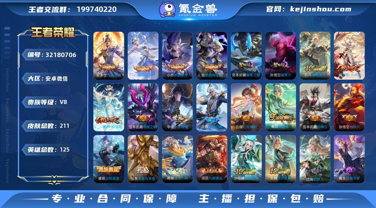 AL691423 【学生党专属:低价成品号,段位皮肤够用,上手能上分】 皮肤数211 传说皮肤数12 星传说皮肤数2 史诗皮肤数48 英雄数125 营地id1740976994 贵族等级【文本】贵族8级 【贵族8级】 星元皮肤2 荣耀典藏4 内测皮肤2 年限皮肤2 限定皮肤49 赛季限定20 史诗皮肤49 战令限定9 勇者皮肤103 其他皮肤42 星元皮肤:孙悟空幽冥火,宫本武藏幽冥之眼; 荣耀典藏:小乔天鹅之梦,花木兰九霄神辉,铠银白咏叹调,伽罗最初的交响; 内测皮肤:艾琳女武神,姬小满妄想食味; 年限皮肤:妲己愿照众生和,澜愿照九州拓; 限定皮肤:少司缘巫礼祀神,艾琳女武神,女娲万灵启世,梦奇顽趣,西施织梦人,鬼谷子克喵,白起死霸装,姬小满小满鸭,虞姬启明星使,阿古朵布丁狗之约,钟馗虚灵犬护,苏烈春野闲踪,狄仁杰鹰眼统帅,阿轲化蝶舞,嫦娥暖冬兔眠,妲己灵卜魔法,暃星界游侠,曹操夜都魔契,后羿千劫归真,狄仁杰魔术师,孙膑茶境仙,马超访茗客,妲己愿照众生和,赵云皇家上将,项羽海滩派对,澜愿照九州拓,雅典娜黎明之约,太乙真人谧流熔炉,牛魔星界战将,桑启鸣野蒿,东皇太一噬灭天穹,盘古敬我三分,姬小满妄想食味,姜子牙天穹之誓,刘邦剑破天穹,沈梦溪龙舞盛年,鬼谷子天穹祈灯,张良古海寻踪,鲁班大师探海日志,狄仁杰阴阳师,裴擒虎擒涛扼浪,桑启海盐诗旅,甄姬落雪兰心,钟无艳超时空战士,鬼谷子五谷丰年,李元芳云中旅人,沈梦溪大漠名商,兰陵王金庭之子,达摩沙漠行僧; 赛季限定:项羽九幽镇关,梦奇顽趣,亚瑟荣光之誓,甄姬逆浪荇歌,钟馗虚灵犬护,雅典娜黎明之约,太乙真人谧流熔炉,牛魔星界战将,东皇太一噬灭天穹,姜子牙天穹之誓,刘邦剑破天穹,鬼谷子天穹祈灯,张良古海寻踪,鲁班大师探海日志,裴擒虎擒涛扼浪,桑启海盐诗旅,李元芳云中旅人,沈梦溪大漠名商,兰陵王金庭之子,达摩沙...