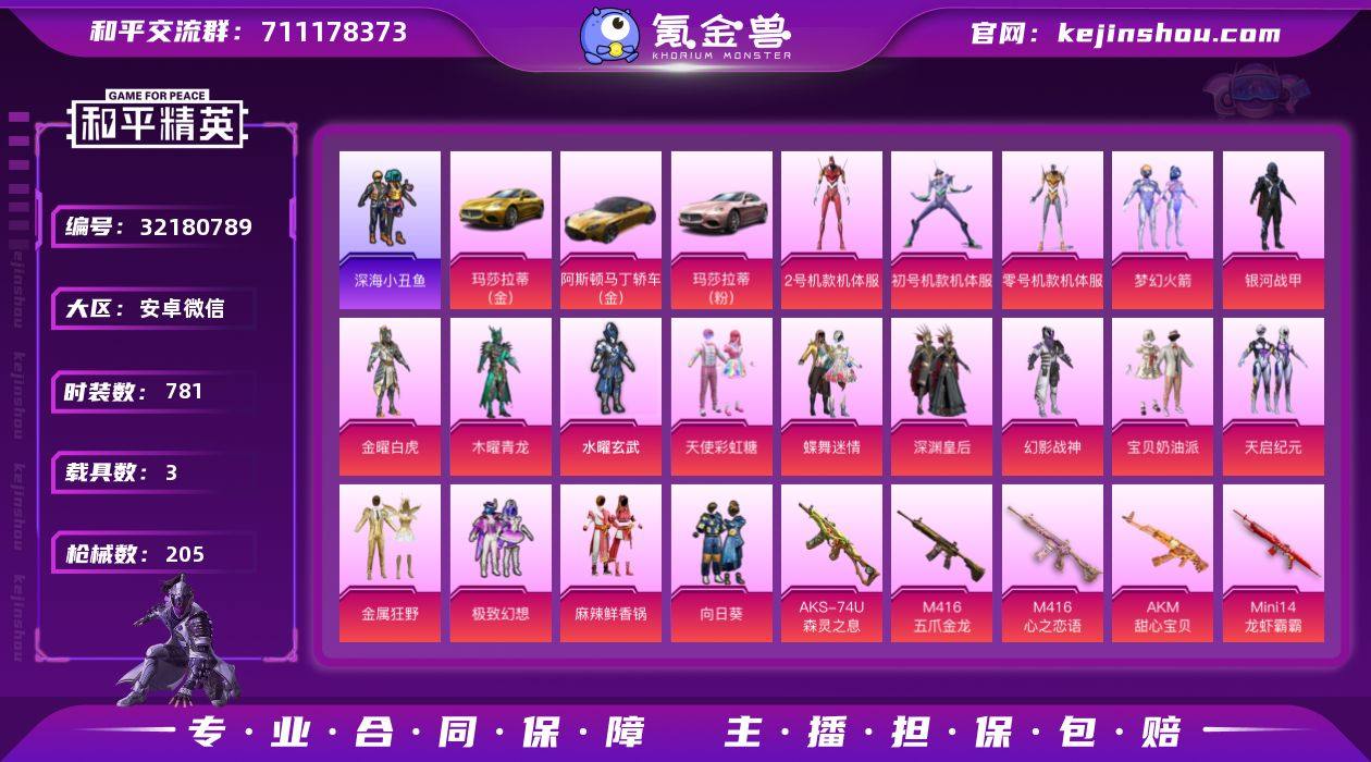 AL691425 【和平绝版皮肤号,稀有度拉满】 热力值87710 枪皮数量205 粉装数17 套装数量192 时装数781 载具数3 战备数140 【是本人】 【可排位】 【包人脸】 【是】 【支持】 【未绑定或可换绑】 【无换绑CD】 其他武器皮肤195 头盔93 动作51 伙伴1 其他武器皮肤:GROZA-福马献瑞,GROZA-雷霆特警,GROZA-治愈之星,GROZA-银河战甲,GROZA-春暖花开,GROZA-乌木金纹,GROZA-黑色刀锋,GROZA-彩虹符号,M416-仓鼠灰灰,M416-时之沙漏,M416-乌木金纹,M416-神秘黑猫,M416-夜灯,AKM-冰凉西瓜,AKM-乌木金纹,AKM-四圣焕新,AKM-虎虎生威,AKM-天启纪元,AKM-春暖花开,AKM-缤纷海域,SCAR-L-生命誓言,SCAR-L-雷霆特警,SCAR-L-炫彩节奏,SCAR-L-银河战甲,SCAR-L-乌木金纹,SCAR-L-凝视深渊,QBZ-乌木金纹,QBZ-洛神天依,QBZ-神秘黑猫,QBZ-银河战甲,QBZ-诡娃娃,M762-折纸暴龙,M762-甜心宝贝,M762-生命誓言,M762-天降萌叽,M762-牛气冲天,M762-乌木金纹,M762-诡娃娃,M762-快乐主宰,M762-拳皇97,M16A4-生命誓言,M16A4-凝视深渊,M16A4-幻世战舞者,M16A4-龙虾霸霸,M16A4-机械英豪,M16A4-红色方程式,AUG-耀粉歌者,AUG-凝视深渊,AUG-青春冒险家,AUG-终结者,AUG-乌木金纹,ACE32-冰晶雪宝,ACE32-画境星梦,蜜獾-虎痴许褚,蜜獾-启元战纹,Mk47-乌木金纹,Mk47-青春冒险家,Mk47-洛神天依,G36C-荒野猎神,G36C-乌木金纹,G36C-不夜海上花,Kar98K-勇闯险境,Kar98K-洛神天依,Kar98K-王子的夏天,Kar98K-乌木金纹,Kar98K-幻影战神,Kar98K-狮舞迎春,M24-冰封烈焰,M24-炫彩节奏,M24-治愈之星,M24-未来战士,M24-乌木金纹,M24-众神之王,AWM-荒野猎神,AWM-不夜海上花,AWM-天降萌叽,AWM-乌木金纹,Win94-机械英豪,SKS-勇闯险境,SKS-诡娃娃,SKS-炫彩节奏,SKS-迅猛狂鲨,SKS-折纸暴龙,SK...