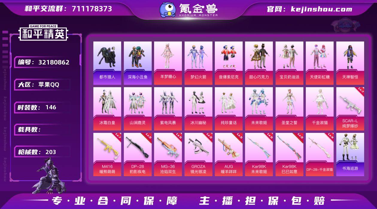 YZJ15608-可二次 苹果Q-2稀有15粉装12特效枪14热门146套装203枪皮 66457热力值 极品公主号 地铁满天赋 新火箭少女 巧克力三姐妹 千金淑猫 羊梦糖心 未来歌姬 圣堂之誓 纯珍童话 冰川幽秘 都市 光子十周年 红眼罩 深海小丑鱼 天命 青涩年华 NV战队服 JDE战队服 赞萌露比伙伴 超萌熊本熊伙伴 满级M4暖熊 满级斯嘎纯梦 4印记 历史超级王牌7星 【2稀有】 都市猎人 浪漫天命 【15粉装】 圣堂之誓 梦幻火箭 宝贝奶油派 天使彩虹糖 甜心巧克力 千金淑猫 未来歌姬 羊梦糖心 纯珍童话 天禅智恒 冰川幽秘 冰霜白皇 音爆索尼克 紫电风暴 山涧鹿灵 【12特效枪】 SCAR-L-纯梦嫁纱 (7级) AKS-74U-森灵之息 (5级) Kar98K-巳巳如意 (5级) MG-36-沧焰双生 (5级) DP-28-千金淑猫 (4级) DP-28-豹影疾电 (5级) AUG-暖羊咩咩 (5级) GROZA-镜光银凌 (5级) M416-暖熊萌萌 (7级) Kar98K-未来歌姬 (5级) AKS-74U-森灵之息 (5级) Mk14-福马献瑞 (4级) UMP45-萌骑冒险 (4级) 【14热门】 小丑鱼 龟仙人 2P战斗服款 光子十周年 青涩年华 鹰眼刺客 恶魔喵喵 深海小丑鱼 NV战队服 JDE战队服 暗影哥特 漫步者 破蛋小黄鸡 弄潮海豚 【4飞行器】 相思残雪飞行器 拂晓神骑飞行器 变形金刚飞行器 星夜魔法师飞行翼 【3头盔】 梦幻火箭头盔 甜心宝贝头盔 深海小丑鱼头盔 【1背包】 甜心宝贝背包 营地ID:929083410