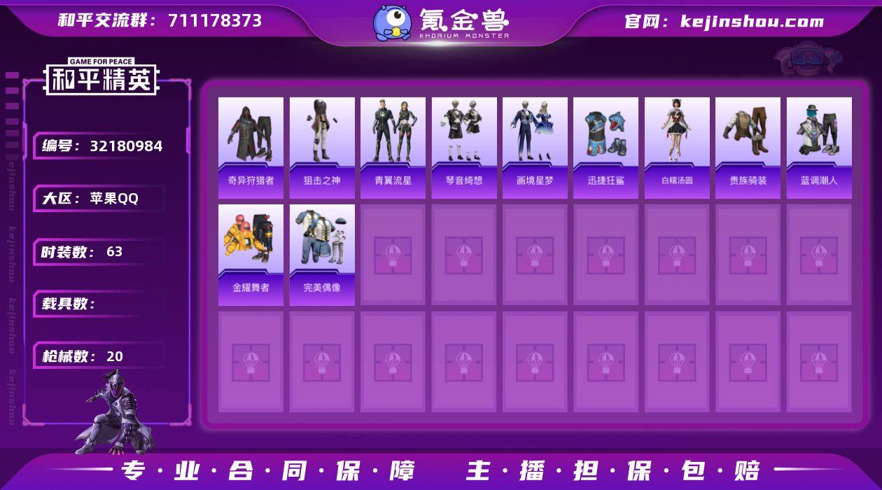 【福利号 奇异狩猎者】 苹果Q区-4533热力值--11套装-20枪皮 【1稀有】 奇异狩猎者【1热门】 迅捷狂鲨 营地ID:1038379469