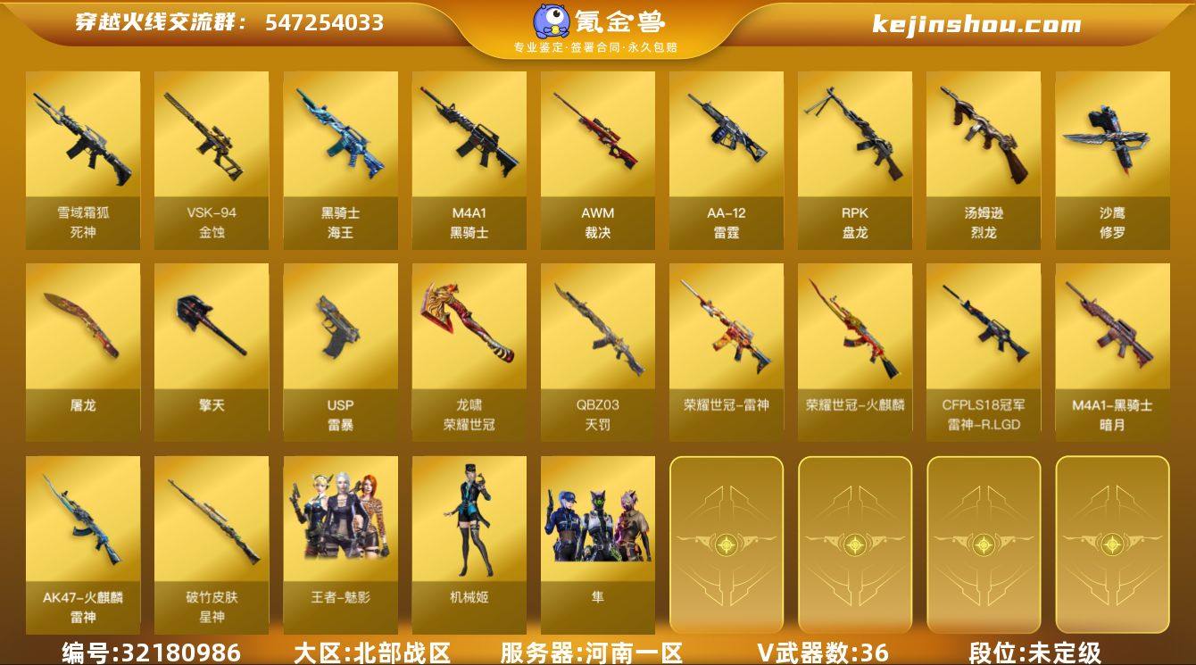 河南一区-41V-3王者-0炫金 【传说角色】:传说星骇 【热门武器】:死亡之眼,荣耀世冠-火麒麟,荣耀世冠-雷神,M4A1-黑骑士*2,汤姆逊-烈龙*3,RPK-盘龙*2,USP-雷暴,沙鹰-修罗,荣耀世冠-龙啸 【音效卡】:AWM-裁决音效卡,Barrett-碧霄极光音效卡,炼狱-百战金芒-庆典舞曲音效卡,死神-雪域霜狐-怀旧音效卡 【皮肤】:白虎-白鲨-CFPLS23冠军,QBZ03-AG-CFPLS19冠军,裁决-巅峰荣耀 皮肤,星神-破竹皮肤,雷神-R.LGD-CFPLS18冠军,M4A1-再燃火线,火麒麟-雷神,黑骑士-暗月,轻型军用手斧-再燃火线 【角色】:隼,机械姬,荆棘,战地猎狐,王者-魅影,雪域霜狐,风暴女,斯沃特-X 【人偶武器】:迷你钢铁终结者,迷你救赎猎手,AWM-灵狐-15周年嘉年华,迷你生化手雷,生化手雷-机甲核心 【暴走生化】:死亡之眼 【英雄级武器】:M4A1-黑骑士*2,QBZ03-天罚,死神-雪域霜狐,SCAR Light-玄豹,黑骑士-海王,荣耀世冠-火麒麟,荣耀世冠-雷神,AWM-裁决,VSK-94-金蚀,王者风神-觉醒版,RPK-盘龙*2,炼狱-百战金芒,汤姆逊-烈龙*3,AA-12-雷霆,沙鹰-修罗,USP-雷暴,USP-冥王,屠龙,擎天,荣耀世冠-龙啸,麒麟刺-百战金芒,丛林匕首-玄豹,王者冰锋-觉醒版,斩神刀-雷暴王者-觉醒版,高爆手雷-玄豹*2,闪光弹-玄豹,烟雾弹-玄豹*4,Barrett-碧霄极光 【道具】:BS战队炫彩背包,云山科技背包,女皇终结者-背包,百战金芒炫彩背包,超级背包,雪域霜狐炫彩背包,圣拳猎手-炽雪,女皇终结者-魔龙之吻,救世主-黑桃战神,绿色巨人,灵魂忍者*2,变异宝贝,迷雾幽灵*2,夺命之镰,防化服*3,流光-鎏金之域,枪王排位29赛季金色流光,语音特效-盛典烟火,语音特效-怀旧,雪域霜狐表情,萌萌小葵表情,炽雪表情,防弹头盔*3,防弹衣*3,C4工具钳*3,手雷包*3 【特殊枪械】:2黑骑士,3烈龙,2盘龙