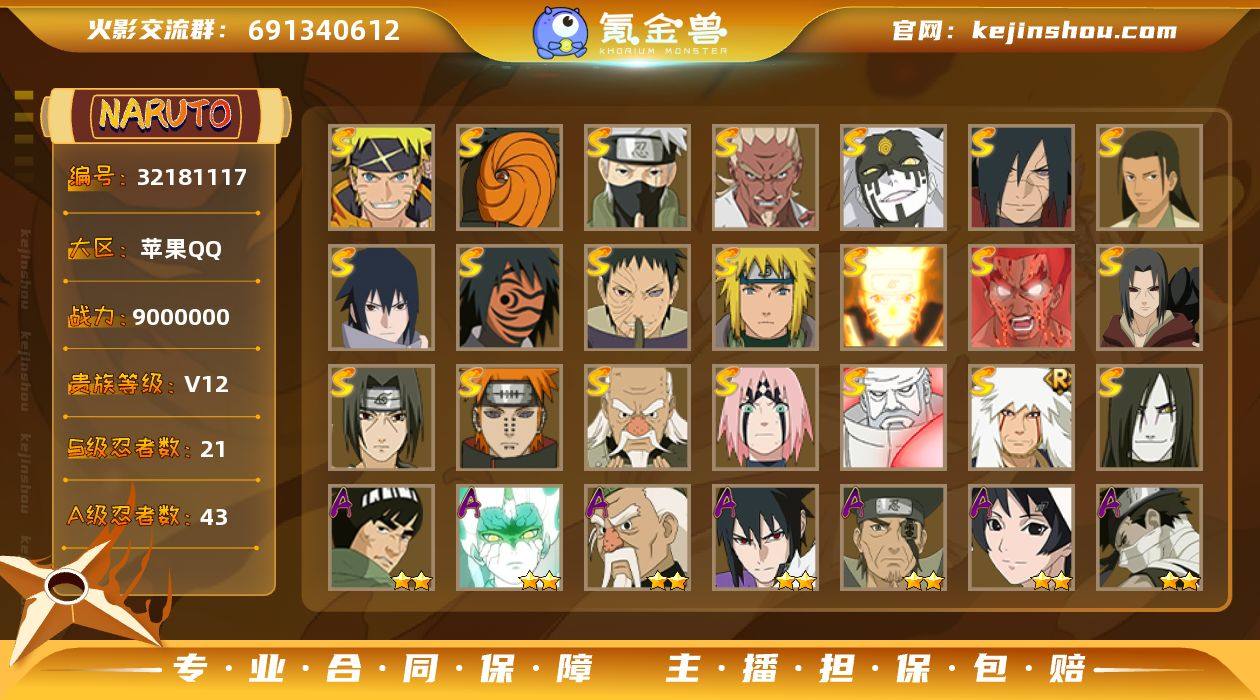 实名: 可修改 贵族等级: V12 S忍数: 21 A忍数: 43 战力值(万): 900 S级忍者: 宇智波鼬「秽土转生」,佩恩「天道」,大蛇丸,波风水门,宇智波鼬 「须佐能乎」,迈特凯「死门」,大野木 「忍界大战」,宇智波带土 「忍界大战」,自来也 「舞之豪杰」,漩涡鸣人 「九喇嘛连结」,大筒木金式「博人传」,春野樱 「忍界大战」,神秘面具男 「红夜之刃」,宇智波佐助「永恒万花筒」,千手柱间·木叶创立,宇智波斑「秽土转生·解」,大筒木桃式,艾「忍界大战」,旗木卡卡西「须佐能乎」,宇智波斑「五影会谈」,漩涡鸣人·宇智波佐助 通灵兽: 熊猫