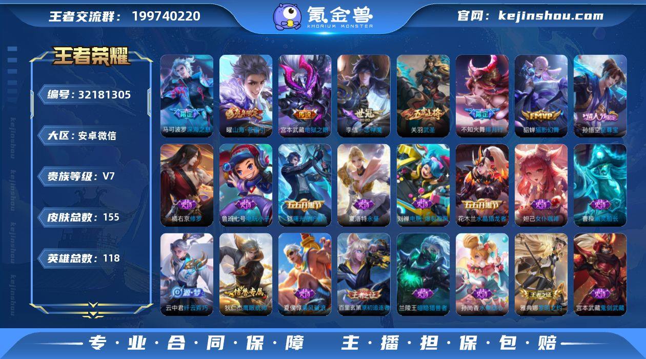 V7 11传说 118英雄 155皮肤 可修改实名 男号 【稀有英雄】大司命,韩信(韩跳跳),夏洛特(夏师傅),艾琳,橘右京(橘子),娜可露露(鸟人),不知火舞,赵云,金蝉(唐僧),戈娅 【传说皮】地狱之眼,一念神魔,猫影幻舞,时之恋人-刘备(电焊工),山海·苍雷引(电光曜子) 【珍宝阁皮】蔷薇恋人,女武神,玩趣恶龙 【赛季/战令皮】古海寻踪(s33),星界游侠,海盐诗旅(s30),擒涛扼浪(s31),探海日志(s32),顽趣-梦奇,天穹祈灯(s34),暖冬·兔眠,混沌棋(s18),疑决卦(s19),醍醐杖(s20),原初探秘者(s21),万华元夜(s22),演武夺筹(s23),驱傩正仪(s24),千军破阵(s25),夺宝奇兵,迷踪丽影,单词大作战,狂想玩偶喵,潮玩骑士王,云间偶戏,神迹守卫-墨子,航海奇遇记,圣弓游侠,真爱魔法,沙漠行僧(s26),金庭之子(s27),电玩高手(电玩铁子),午后时光,大漠名商(s28),云中旅人(s29) 【史诗皮】紫霞仙子,电玩小子(小书包),永昼,蒙恬荣光圣徽,电玩·爆裂旋风,末日机甲-吕布,猫狗日记-孙策,乱世虎臣,修罗,女仆咖啡,水果甜心,德古拉伯爵,暗隐猎兽者,幽灵船长,鬼剑武藏,纤云弄巧,乘风破浪,逐浪之夏,水晶猎龙者,曙光守护者,金属风暴,原初追逐者,圣诞狂欢,鹰眼统帅,魅力维加斯,黎明之约,赏金猎手,无心 【限定皮】鸣野蒿,至尊宝,绯月行,...