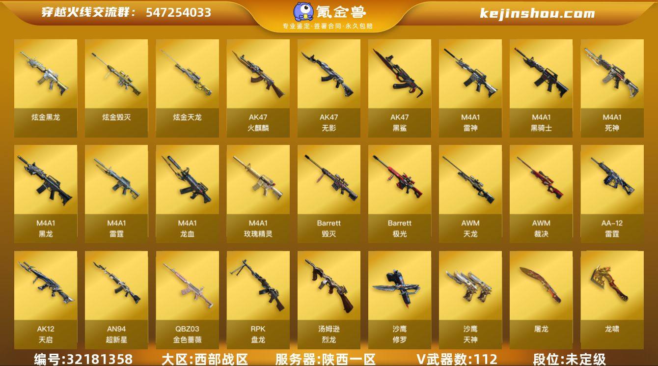 【商品标题】:陕西一区-118V-4王者-4炫金 【热门武器】:QBZ03-金色蔷薇*2,M200-竞技荣光,死亡之眼*2,M4A1-黑骑士,汤姆逊-烈龙*7,RPK-盘龙,斯泰尔-蝴蝶,裁决-雪莉杨,USP-雷暴*2,沙鹰-修罗*6 【王者炫金武器】:炫金骑士,炫金天龙,炫金黑龙,炫金毁灭 【音效卡】:AK47-火麒麟音效卡,M4A1-雷神音效卡,Barrett-毁灭音效卡 【稀有皮肤】:雷神-能量核心,火麒麟-盘古,毁灭-星空,AWM-天龙-传奇白鲨,无影耀金皮肤 【角色】:零-水下丽影,审判者,零,葵,樱,炫,电竞教官-云悠悠,铁骑荣耀 【人偶武器】:裁决-雪莉杨,斯泰尔-蝴蝶,AWM-灵狐-15周年嘉年华,M37-葵,COP-旗袍,迷你生化手雷 【暴走生化】:斯泰尔-蝴蝶,死亡之眼*2 【挑战大师】:神圣爆裂者III,激光毁灭者III 【英雄级武器】:M200-竞技荣光,柯尔特-竞技荣光,擎天-竞技荣光,高爆手雷-竞技荣光,烟雾弹-竞技荣光,闪光弹-竞技荣光,USP-雷暴*2,斩神刀-雷暴,M4A1-雷霆,QBZ03-金色蔷薇*2,M4A1-雷神*2,M4A1-黑龙,M4A1-玫瑰精灵,M4A1-黑骑士,M4A1-死神,RPK-盘龙,汤姆逊-烈龙*7,AK47-无影,AK47-火麒麟*2,AK12-天启,AN94-超新星*5,AWM-天龙*2,Barrett-毁灭*3,Barrett-极光*2,AWM-裁决,M4A1-龙血,AA-12-雷霆,AK47-黑鲨*2,AK-47-猩红传说,M4A1-赤狱骑士,沙鹰-天神*5,沙鹰-修罗*6,麒麟刺*6,擎天*5,龙啸,屠龙*5 【特殊枪械】:蝴蝶斯泰尔+6烈龙,1黑骑士,6烈龙,1盘龙,1蝴蝶斯泰尔