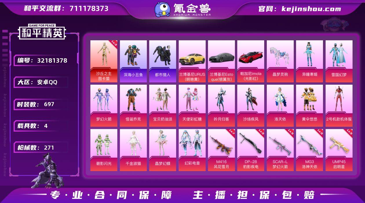 安卓 手Q-12粉装-8特效枪-14载具-4粉色飞行器-93990热力值-12王牌印记-198套装-210枪皮 【热门品类】:套装-S1赛事,套装-浪漫天命,套装-冥河战士,套装-金羽特工,套装-沙漠守护者,套装-AG战队服,套装-SS1特训,套装-龟仙人,套装-潮萌小黄鸭,套装-暗影哥特,套装-浪漫波比,套装-粉红小猪,熔岩游骑兵连帽夹克 【粉色套装】:粉装-幻影战神,粉装-宝贝奶油派,粉装-天使彩虹糖,粉装-扶摇飞仙,粉装-锦绣火鲤,粉装-冰霜白皇,粉装-炙焰红王,粉装-暗翼战神,粉装-蜜桃特工,粉装-彩虹鹿灵,粉装-精灵娃娃,粉装-暖熊萌萌 【粉色枪皮等级】:AKM-百合蜜语(四级),SCAR-L-童趣迷兔(四级),M416-心之恋语(一级),M416-暖熊萌萌(七级),AUG-星之彼岸(三级),M762-甜蜜誓约(五级),UMP45-相思残雪(四级),M249-蓝莓炮弹(二级) 【粉色载具】:特斯拉Roadster(沁心粉),兰博基尼Aventador SVJ(翡翠绿),兰博基尼Estoque(银翼灰),兰博基尼URUS(明艳黄),阿斯顿马丁DBS(绿),阿斯顿马丁DBX(橙),路特斯ELETRE(冰川蓝),玛莎拉蒂Quattroporte(夜幕蓝),玛莎拉蒂Ghibli(粉),合金龙骨(蓝),灵鼠银迹,萌喵橘座,鬼马风驰,空客H135-蔚蓝之翼,快艇-塞莎KL27(深潜蓝) 【粉色枪皮】:AKM-百合蜜语,SCAR-L-童趣迷兔,M416-心之恋语,M416-暖熊萌萌,AUG-星之彼岸,M762-甜蜜誓约,UMP45-相思残雪,M249-蓝莓炮弹 【粉色飞行器】:梦幻火箭飞行器,扶摇飞仙飞行器,锦绣火鲤飞行器,暗翼战神飞行器 【粉色降落伞】:甜心宝贝降落伞,神秘黑猫降落伞,甜蜜誓约降落伞,四圣焕新降落伞,扶摇飞仙降落伞,潮汐统领降落伞,锦绣火鲤降落伞,夏日绵绵冰降落伞,银刃赛罗降落伞,暗翼战神降落伞,怪笑疯兔降落伞,枪炮玫瑰降落伞,绚金瑰梦降落伞,甜心娃娃降落伞,百合蜜语降落伞,环太平洋降落伞,暖...