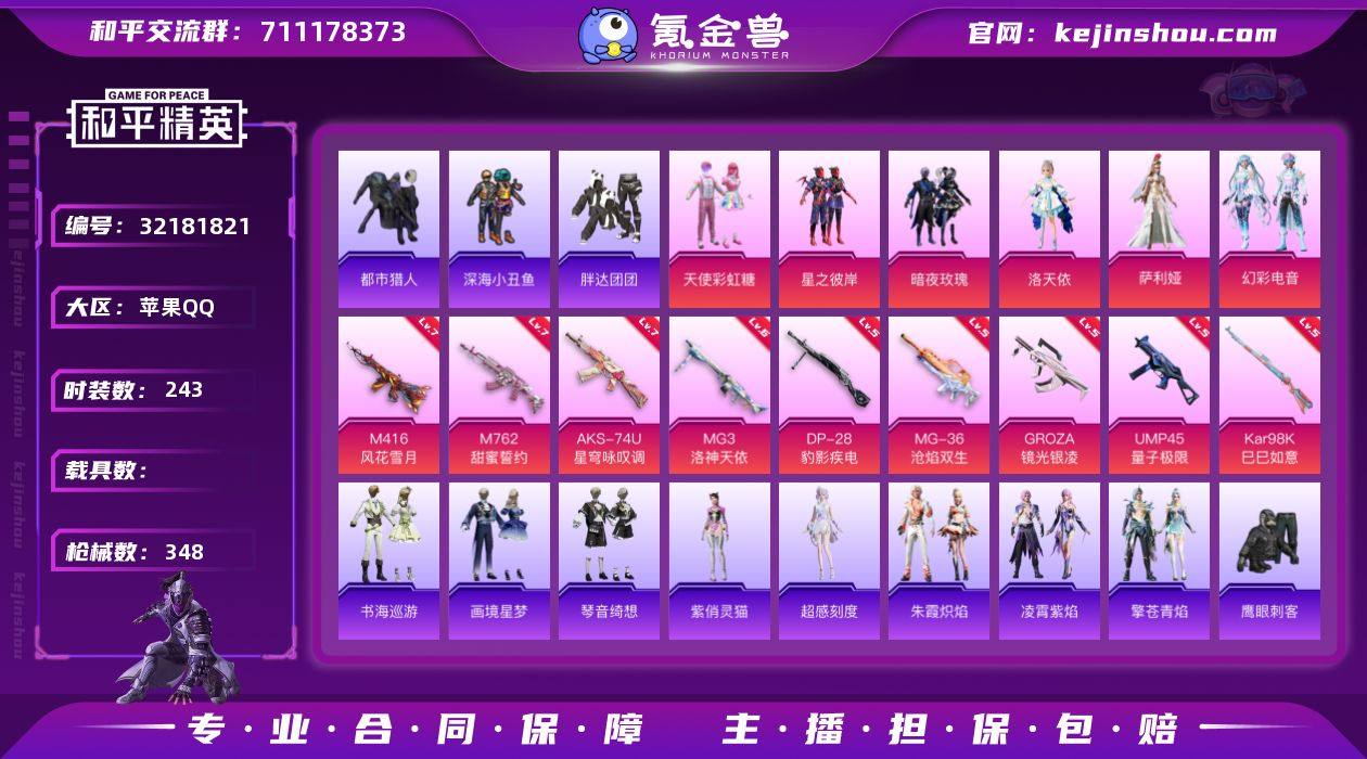 YZJ15549-可二次 苹果Q-4稀有8粉装11特效枪22热门243套装348枪皮 109515热力值 精品小身法号 地铁满天赋 洛天依 虎痴许褚 彩虹糖 星之彼岸 都市 红眼罩 胖达团团 深海小丑鱼 鲨鱼服 蓝螳螂 罗小黑 软萌银虎 天命 满级M4风花雪月 满级M762甜蜜誓约 满级AKS咏叹调 6级MG3洛神天依 14印记 历史传奇王牌17星 【4稀有】 AWM-黄金龙骨 AKM-缤纷海域 都市猎人 浪漫天命 【8粉装】 萨利娅 天使彩虹糖 虎痴许褚 洛天依 幻彩电音 星之彼岸 暗夜玫瑰 【11特效枪】 AKS-74U-星穹咏叹调 (7级) Kar98K-巳巳如意 (5级) M762-甜蜜誓约 (7级) MG-36-沧焰双生 (5级) DP-28-豹影疾电 (5级) UMP45-量子极限 (5级) GROZA-镜光银凌 (5级) M416-风花雪月 (7级) MG3-洛神天依 (6级) Mk14-福马献瑞 (5级) ACE32-萌骑漫游 (2级) 【22热门】 Mark.06 龟仙人 雪山精英 呆萌铁蟹 鹰眼刺客 软萌银虎 迅捷狂鲨 深海小丑鱼 罗小黑 胖达团团 暗影哥特 醒狮腾龙 团圆交子 瑞龙福将 纯白誓言 粉红小猪 漫步者 破蛋小黄鸡 极速红龙 弄潮海豚 M762-瑞龙福将 M762-风花雪月 【3飞行器】 繁龙极客飞行器 镜光幻境飞行翼 萌物绒绒飞行器 【2头盔】 甜心宝贝头盔 金风玉露头盔 【5背包】 甜心宝贝背包 深海曼妙背包 神秘黑猫背包 甜蜜誓约背包 马卡龙背包 营地ID:722494302