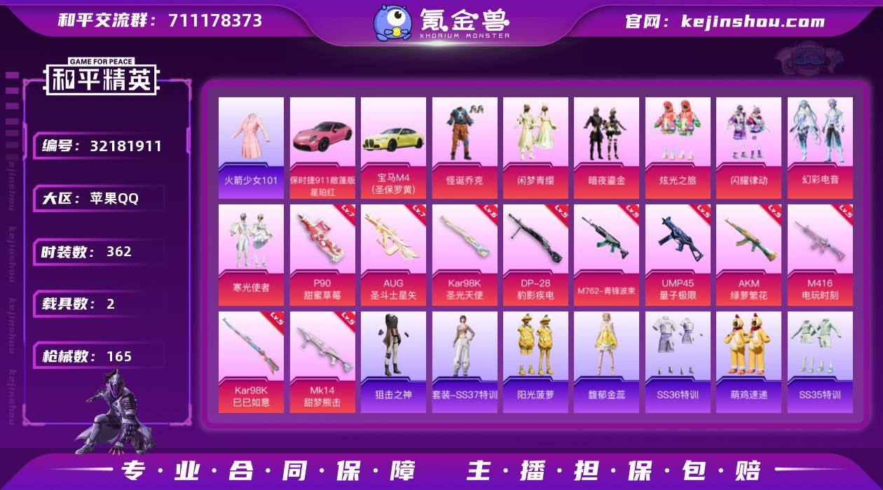 实名:可二次实名 是否支持人脸包赔:支持 粉装数量:7 特效枪数量:10 载具数:2 时装数:362 枪械数:165 火箭少女101 暗夜鎏金,怪诞乔克,幻彩电音,寒光使者,闪耀律动,炫光之旅,闲梦青缨 七级AUG-圣斗士星矢,七级P90-甜蜜草莓,六级Kar98K-圣光天使,五级DP-28-豹影疾电,五级AKM-绿萝繁花,五级Kar98K-巳巳如意,五级M416-电玩时刻,五级M762-青锋波束,五级MK14-甜梦熊击,五级UMP45-量子极限 保时捷911敞篷版(星珀红),宝马M4(圣保罗黄) 狙击之神,SS37特训,馥郁金蕊,阳光菠萝,SS36特训,火箭少女101,炫彩糖果,萌鸡速递,SS35特训,元气之梦,SS34特训套装,缤纷果语,白虎圣者,雏菊兔兔,长空猛禽,创世·幻影,顶瓜瓜,蝶变,绯格组合,疯狂小兔子,龟仙人,光之冒险,华灯初上,鹤鸣,湖蓝色名流,黄色名流,幻世战舞者,幻羽潜行,绝对偶像,金戈铁马,酒红色名流,惊鸿侠骨,竞技达人朋克,竞技名士,晶灵使者,锦衣飞扬,蓝冰羽,龙的传人,龙魂突击队,萝兰蝴蝶,摩登王国,果汁能量,茉莉之诺,懵萌河马,霓虹热舞,柠萌假日,浓情蜜辣,牛气满满,破蛋小黄鸡,千禧之恋,青玉碎影,云朵鹅,荣耀,日照花林,深海梦境,深蓝色名流,神气柴柴,圣穹绘梦,SS19特训,SS20特训,SS21特训,SS22特训,SS23特训,SS24特训,SS25特训,SS26特训,SS27特训,SS28特训,SS29特训,SS30特训套装,SS31特训套装,SS32特训套装,SS33特训套装,时希公主,探宝勇士,涂山之恋,完美偶像,王牌教练,小丑鱼,雪绒豹,夏日倾情,雪山精英,香桃花海,耀粉歌者,荧惑魅影,雨林探路者,银松藏云,焰鹰斗篷,幽夜迷踪,异域银装,紫幽梦 炫彩糖果飞行器,甜梦小狐飞行器,炫彩糖果降落伞,暗夜鎏金降落伞,百合蜜语降落伞,第五大道降落伞,幻彩电音降落伞,橘柚倾心降落伞,圣光天使降落伞,甜蜜草莓降落伞,未来歌姬降落伞,炫光之旅降落伞,闲梦青缨降落伞,星穹咏叹调降落伞 卖家说:老101,小丑面具,升级枪除一把98K其余九把全部满级
