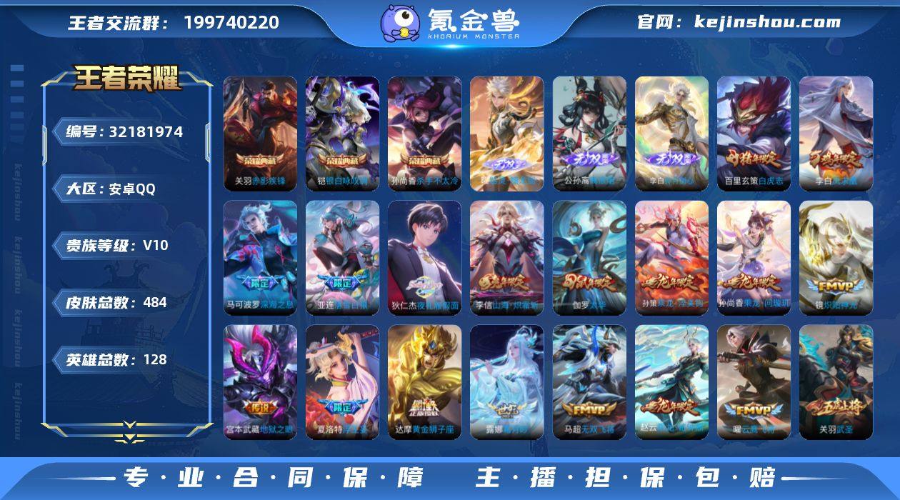 V10 3典藏 4无双 1珍品传说 55传说 128英雄 484皮肤 可修改实名 男号 【英雄全皮】露娜全皮,司空震全皮,典韦全皮,蒙恬全皮,敖隐全皮,空空儿全皮,孙权全皮,蚩奼全皮,姜子牙全皮,苍全皮,狂铁全皮,鬼谷子全皮,戈娅全皮,刘邦全皮,钟馗全皮,亚连全皮,夏洛特全皮,影全皮,大禹全皮 【稀有英雄】敖隐(小龙人),大司命,嬴政(始皇帝),韩信(韩跳跳),夏洛特(夏师傅),艾琳,橘右京(橘子),娜可露露(鸟人),不知火舞,赵云,金蝉(唐僧),戈娅 【荣耀水晶】赤影疾锋,银白咏叹调(倪克斯侍卫),杀手不太冷 【无双皮】无相,器灵·螭龙剑,离恨烟(公孙离无双),碎月剑心(李白无双) 【珍品传说】兔狲·蓬尾 【传说皮】典韦战鼓燎原,落雪白狼,吕布曦玄引,貂蝉曦玄引,乘龙·淬吴钩(孙策年限),乘龙·铭钟鼎(赵云年限),琥珀纪元马超,琥珀纪元铠,乘龙·问璇玑(孙尚香年限),幻光神枪,神树通天,游龙清影(小青龙),永恒水手月亮,山海·炽霜斩(李信年限),黄金狮子座,黄金射手座,地狱火,地狱之眼,末日机甲-孙尚香(绿蚂蚱),云霓雀翎,冠军飞将,久胜战神,猫影幻舞,云鹰飞将(小将军),炽阳神光,无双飞将,音你心动-周瑜,时之恋人-刘备(电焊工),飞鸢探春,超时空战士-狄仁杰,挚爱之约,燃星之曲,浮生妄,鹤羽星尊,妄想实况,惊梅引,夜礼...