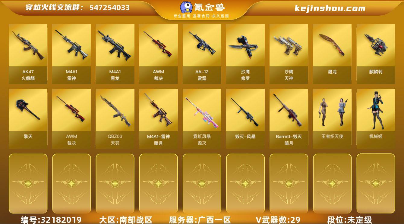 广西一区-32V-2王者-0炫金 【传说角色】:传说星骇 【热门武器】:死亡之眼,沙鹰-修罗*2 【音效卡】:AWM-裁决音效卡,Barrett-碧霄极光音效卡,麒麟刺-百战金芒-盛典舞曲音效卡,炼狱-百战金芒-庆典舞曲音效卡 【皮肤】:裁决-叶芒苍灵 皮肤,雷神-暗月,M4A1-再燃火线,雷神-神秘按键 皮肤,毁灭-暗月,毁灭-风暴,毁灭-虹光风暴 皮肤,AWM-再燃火线,金蚀-课桌奇兵 皮肤,修罗-百战金芒 皮肤,天神-春花弄影 皮肤,轻型军用手斧-再燃火线,麒麟刺-荣耀世冠白鲨 【角色】:机械姬,战地猎狐,雪域霜狐,炽天使,初恋灵狐,风暴女,疾风,斯沃特-X,智影 【人偶武器】:USP-铃狮送福,迷你地狱终结者,AWM-灵狐-15周年嘉年华,生化手雷-机甲核心 【暴走生化】:死亡之眼 【英雄级武器】:AK47-火麒麟,M4A1-黑龙,M4A1-雷神,QBZ03-天罚,SCAR Light-玄豹,QBZ03-独角-III,AWM-裁决,王者之决-觉醒版,炼狱-百战金芒,AA-12-雷霆,沙鹰-修罗*2,沙鹰-天神*2,USP-冥王,屠龙*2,擎天*2,麒麟刺,麒麟刺-百战金芒,丛林匕首-玄豹,高爆手雷-玄豹*2,闪光弹-玄豹,烟雾弹-玄豹,M4A1-赤狱骑士,Barrett-碧霄极光 【道具】:BS战队炫彩背包,云山科技背包,亚洲杯纪念炫彩背包,女皇终结者-背包,百战金芒炫彩背包,雪域霜狐炫彩背包,圣拳猎手-炽雪,终极猎手-荒漠刀客,终极猎手-秦魂将军,虚空终结者-暗域熔岩,女皇终结者-魔龙之吻,救世主-黑桃战神,绿色巨人,灵魂忍者*2,妖姬,迷雾幽灵,夺命之镰,防化服*3,流光-鎏金之域,流光-再燃火线,枪王排位29赛季金色流光,语音特效-盛典烟火,语音特效-怀旧,雪域霜狐表情,萌萌小葵表情,C4-黑曜,C4-再燃火线,防弹头盔*3,防弹衣*3,C4工具钳*3,手雷包*3 【特殊枪械】:
