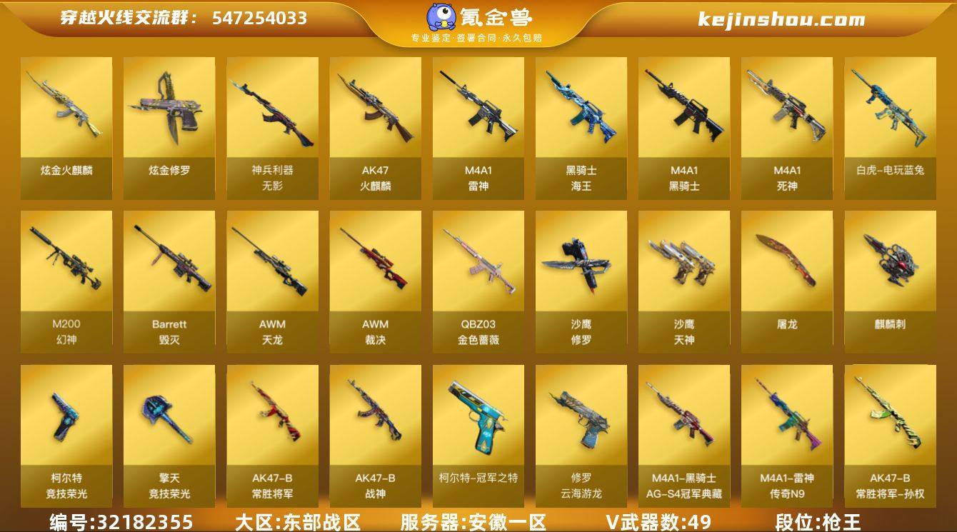 安徽一区-50V-3王者-2炫金 【热门武器】:QBZ03-金色蔷薇,M200-幻神,白虎-电玩蓝兔,柯尔特-冠军之特,M4A1-黑骑士,USP-雷暴,沙鹰-修罗 【王者炫金武器】:炫金火麒麟,炫金修罗 【音效卡】:M4A1-雷神-云海游龙音效卡,M4A1-黑骑士音效卡 【皮肤】:幻神-CFS2022,M200-幻神-N9-2022MVP,幻神-动感闪耀 皮肤,幻神-电流骇客 皮肤,幻神-电竞之星 皮肤,ScarLight-白虎-冠军之虎皮肤,雷神-传奇N9,火麒麟-雷神,火麒麟-华夏之心,火麒麟-心动糖果,毁灭-英雄计划 皮肤,黑骑士-AG-S4冠军典藏,战神-粉色甜心皮肤*2,战神-紫绶金章皮肤*2,战神-流金岁月皮肤,AK47-B-常胜将军-孙权*3,屠龙-荣耀之锋*3,屠龙-荣耀世冠AG,屠龙-春桃 皮肤 【角色】:王者-葵-貂蝉,王者玲珑-小乔,堕落女神,云海玲珑,暗夜-X,初恋灵狐,风暴女,嘉年华灵狐,潘多拉-X,潘多拉-甜心教官,斯沃特-X,蜀雪,兔囡囡,影武者-X 【人偶武器】:天龙-曼陀罗,AWM-灵狐-15周年嘉年华,生化手雷-机甲核心,闪光弹-小乔,闪光弹-貂蝉,高爆手雷-大乔,迷你超能女侍,灵狐娃娃手雷 【暴走生化】:超级对讲机 【挑战大师】:AK47-冰龙粉碎者,激光毁灭者III-白马银枪,激光毁灭者III,阐释者III 【英雄级武器】:AK47-火麒麟*2,M4A1-雷神,M4A1-黑骑士,M4A1-死神,无影-神兵利器,QBZ03-金色蔷薇,AK47-B-战神,黑骑士-海王,AK47-B-常胜将军,白虎-电玩蓝兔,AWM-天龙,Barrett-毁灭,AWM-裁决,M200-幻神,沙鹰-修罗,沙鹰-天神,USP-雷暴,柯尔特-冠军之特,柯尔特-竞技荣光*4,修罗-云海游龙,屠龙*2,马来剑-夜魔,麒麟刺,擎天-竞技荣光,高爆手雷-夜魔,高爆手雷-竞技荣光*2,手雷-云海游龙,闪光弹-夜魔,闪光弹-幻灵*2,闪光弹-竞技荣光*2,烟雾弹-夜魔,烟雾弹-幻灵*3,烟雾弹-竞技荣光*2 【道具】:BS战队炫彩背包,战舰背...