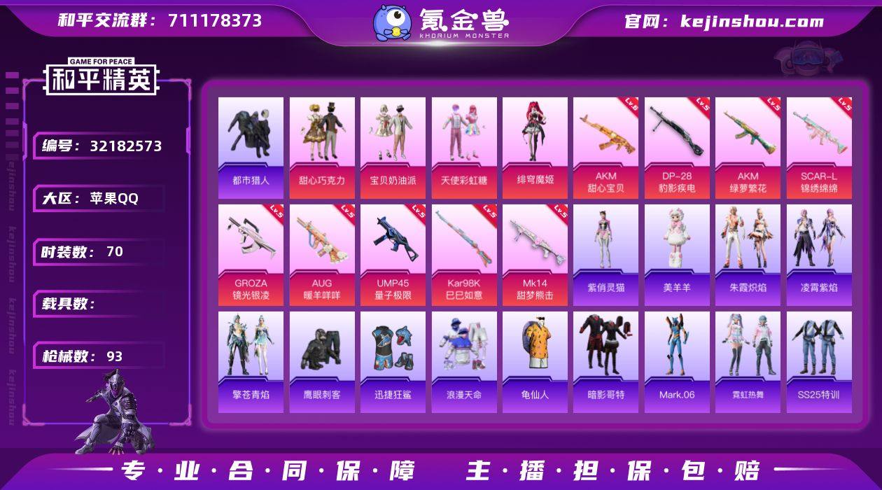 苹果 【身法号 浪漫天命/都市猎人/暗影哥特/Mark.06/M416-星际漫游/甜心巧克力/AKM-甜心宝贝(六级)/SCAR-L-锦绣绵绵(五级)】手Q-4粉装-9特效枪-0载具-2粉色飞行器-27797热力值-1王牌印记-70套装-93枪皮 【热门品类】:套装-浪漫天命,套装-都市猎人,套装-龟仙人,套装-暗影哥特,角色-Mark.06,M416-星际漫游 【粉色套装】:粉装-甜心巧克力,粉装-宝贝奶油派,粉装-天使彩虹糖,角色-绯穹魔姬 【粉色枪皮等级】:AKM-甜心宝贝(六级),AKM-绿萝繁花(五级),SCAR-L-锦绣绵绵(五级),GROZA-镜光银凌(五级),AUG-暖羊咩咩(五级),UMP45-量子极限(五级),Kar98K-巳巳如意(五级),Mk14-甜梦熊击(五级),DP-28-豹影疾电(五级) 【粉色枪皮】:AKM-甜心宝贝,AKM-绿萝繁花,SCAR-L-锦绣绵绵,GROZA-镜光银凌,AUG-暖羊咩咩,UMP45-量子极限,Kar98K-巳巳如意,Mk14-甜梦熊击,DP-28-豹影疾电 【粉色飞行器】:炫彩糖果飞行器 【粉色降落伞】:幻影战神降落伞,甜心宝贝降落伞,闲梦青缨降落伞,忍者神龟降落伞,喜羊羊与灰太狼降落伞,异瞳寒姬降落伞,炫彩糖果降落伞 【稀有套装】:套装-龟仙人,套装-霓虹热舞,套装-朱霞炽焰,套装-凌霄紫焰,套装-擎苍青焰,玩偶服-美羊羊,角色-紫俏灵猫 【稀有枪皮】:AKM-影袭,AKM-星之彼岸,AKM-江南烟雨,M16A4-星际漫游,SCAR-L-夜灯,M416-星际漫游,M416-糯团青竹,M416-蓝色火焰,GROZA-影袭,AUG-耀粉歌者,QBZ-彩虹符号,M762-天降萌叽,M762-甜心宝贝,G36C-星际漫游,蜜獾-天降萌叽,ARX-凌霄紫焰,UZI-啾咪啾咪,UZI-影袭,UMP45-夜灯,UMP45-星际漫游,JS9-凌霄紫焰,P90-巳巳如意,Kar98K-影袭,M24-影袭,Mini14-星际漫游,Mini14-绯穹魔姬,S686-生命誓言,S686-千金淑猫,S12K-破晓战魂,S12K-夜灯,DBS-幻彩电音,M249-彩虹符号,DP-28-甜心宝贝,MG-36-凌霄紫...