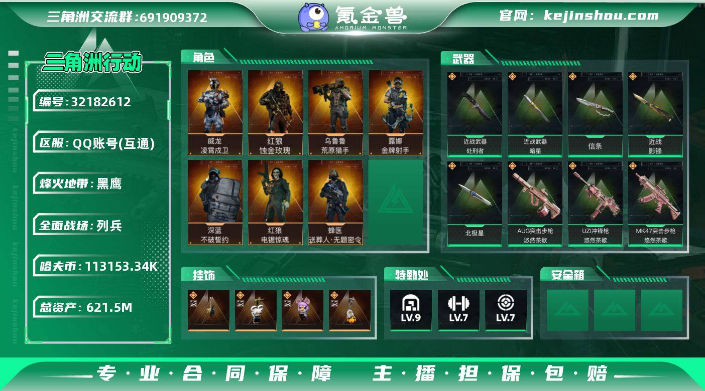 实名:可二次实名 总资产:621.5M 哈夫币:113153.34K 烽火地带段位:黑鹰 烽火地带等级:60 全面战场段位:列兵 全面战场等级:10 9级仓库,7级训练中心,7级靶场,5级指挥中心,1级潜水中心,3级防具台,3级工作台,3级制药台,3级技术中心,1级收藏室 战术部门等级:3 战斗部门等级:2 医疗部门等级:3 研发部门等级:3 后勤部门等级:3 曼德尔砖-气象感应:0 曼德尔砖-命运王牌:0 曼德尔砖-电玩高手:0 曼德尔砖-美杜莎:0