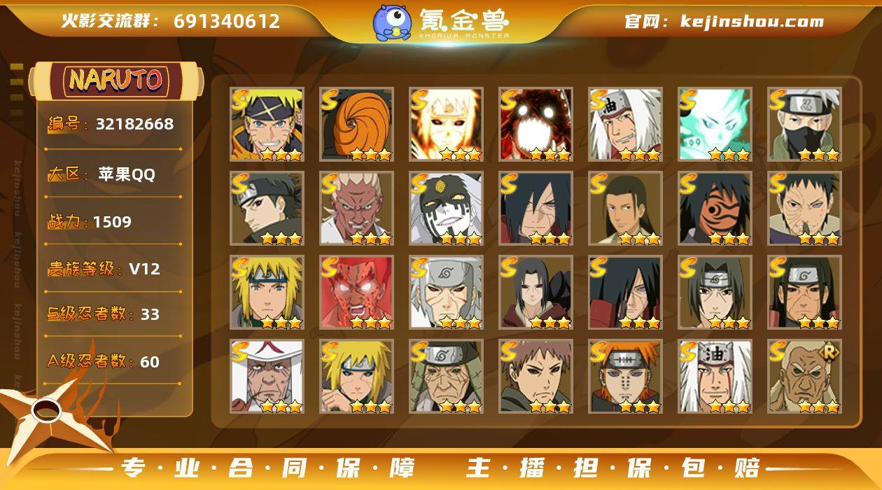 【火影忍者】战斗力:1509W+;段位:中忍2阶;本服排名:130;VIP:V12级;S忍:33个;A忍:60个;通灵兽:20个,S忍:秽土转生解宇智波斑|白面具宇智波斑|忍界大战宇智波带土|须佐能乎旗木卡卡西|秽土转生千手扉间|九喇嘛连结波风水门|五影会谈宇智波斑|天道佩恩|传说中的三忍自来也|漩涡鸣人宇智波佐助|须佐能乎宇智波止水|秽土转生千手柱间|秽土转生宇智波鼬|最终章大筒木舍人|木叶创立千手柱间|忍界大战艾|舞之豪杰自来也|大蛇丸(普通)|波风水门|秽土转生波风水门|秽土转生宇智波斑|须佐能乎宇智波鼬|红夜之刃神秘面具男|三代目雷影艾|四代目风影罗砂|死门迈特凯|忍界大战春野樱|博人传大筒木金式|大筒木桃式|猿飞日斩(普通)|秽土转生猿飞日斩|自来也(普通)|暴怒第六尾漩涡鸣人__A忍:青春爆炸迈特凯|漂泊浪客宇智波带土|仙人模式巳月|幻之真容旗木卡卡西|侠隐江湖药师兜|忍界大战李洛克|漂泊浪客佩恩六道|秽土转生角都|忍界大战日向宁次|四代目土影黑土|木叶上忍猿飞木叶丸|青年长门|秽土转生迪达拉|宇智波止水(普通)|不风|忍界大战奇拉比|青年波风水门|青年艾|漂泊武士桃地再不斩|近松十人卫千代|半蛇斗篷药师兜|须佐能乎宇智波佐助|九尾查克拉漩涡鸣人|七夕限定猿飞阿斯玛|晓大蛇丸|百豪春野樱|忍界大战秋道丁次|忍界大战我爱罗|秽土转生猿飞阿斯玛|奇拉比(普通)|万花筒写轮眼宇智波佐助|五代目雷影达鲁伊|死司凭血飞段|疾风传我爱罗|迪达拉(普通)|飞段(普通)|小南(普通)|漂泊浪客小南|神驹佑将小南|仙人模式漩涡鸣人|万花筒写轮眼旗木卡卡西|神威对决旗木卡卡西|迈特凯(普通)|宇智波鼬(普通)|夏日限定宇智波鼬|干柿鬼鲛(普通)|秽土转生桃地再不斩|桃地再不斩|绯流琥蝎|蝎(普通)|猿飞阿斯玛(普通)|桃式显现漩涡博人|最终章日向雏田|六代目水影长十郎|宇智波泉奈|羁绊神农|夏日限定...