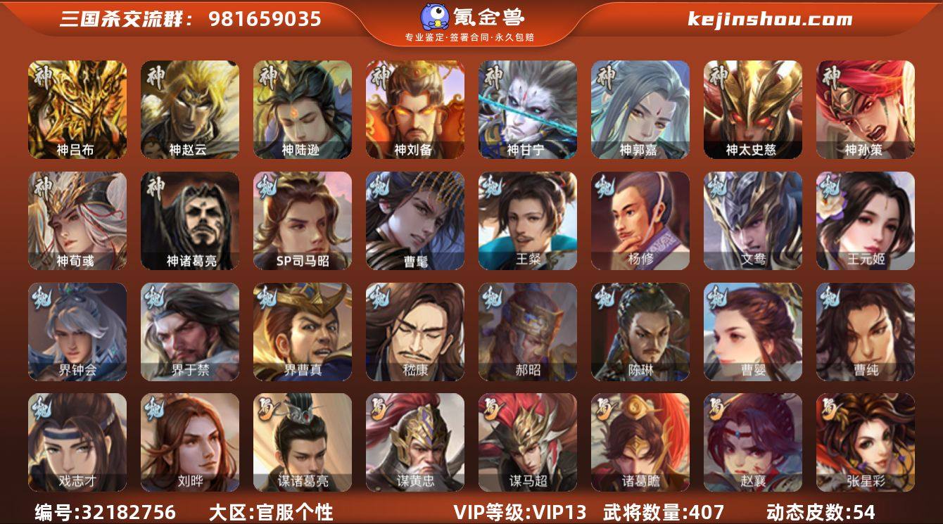 [15588553]标题:S35407 VIP等级:VIP13 官阶:大将军 史诗武将数量:70 动态皮肤数量:54 史诗宝珠数量:21 将魂数量:2431 雁翎数量:63316 心愿积分:1640 史诗武将(魏国):文鸯,曹髦,曹婴,王元姬,界钟会,戏志才,清河公主,司马昭,SP司马昭,界曹真,嵇康,杨修,陈琳,刘晔,王粲,界于禁,程昱,曹纯,郝昭 史诗武将(蜀国):谋黄忠,谋诸葛亮,沙摩柯,花鬟,张星彩,王平,诸葛瞻,界黄忠,马云禄,赵襄,谋马超 史诗武将(吴国):谋黄盖,孙寒华,界徐盛,留赞,骆统,势太史慈,界步练师,界朱然,吴景,贺齐,孙皓,文鸯 史诗武将(群雄):刘焉,十常侍,星董卓,杜预,界左慈,南华老仙,许攸,麹义,司马昭,庞德公,界李儒,星黄忠,张让,王允,卑弥呼,左慈,兀突骨,沮授,陶谦,苏飞,公孙康 史诗武将(神将):神郭嘉,神荀彧,神甘宁,神孙策,神太史慈,神赵云,神陆逊,神吕布,神刘备 其他亮点:欢乐豆30560