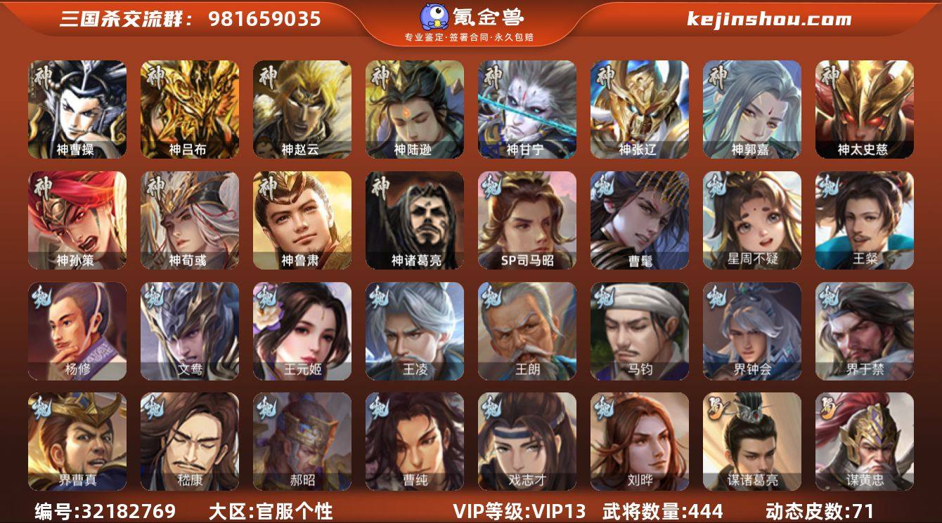 [17306601]标题:S36257 VIP等级:VIP13 官阶:大将军 史诗武将数量:77 动态皮肤数量:71 史诗宝珠数量:29 将魂数量:1288 雁翎数量:13957 心愿积分:11658 史诗武将(魏国):文鸯,曹髦,马钧,王元姬,界钟会,戏志才,势辛宪英,清河公主,司马昭,王朗,SP司马昭,星周不疑,王凌,界曹真,嵇康,杨修,刘晔,王粲,界于禁,程昱,曹纯,郝昭 史诗武将(蜀国):谋黄忠,谋诸葛亮,谋赵云,谋夏侯氏,沙摩柯,关索,周群,花鬟,谯周,张星彩,王平,界黄忠,马云禄,赵襄,谋马超 史诗武将(吴国):谋黄盖,界徐盛,留赞,周处,界步练师,界朱然,吴景,贺齐,孙皓,文鸯 史诗武将(群雄):刘焉,星董卓,杜预,杨彪,界左慈,张琪瑛,祢衡,南华老仙,许攸,麹义,司马昭,星甘宁,界李儒,星黄忠,张让,卑弥呼,左慈,兀突骨,沮授,陶谦,苏飞 史诗武将(神将):神郭嘉,神荀彧,神甘宁,神曹操,神孙策,神鲁肃,神太史慈,神赵云,神陆逊,神吕布,神张辽 其他亮点:欢乐豆24799,有年卡