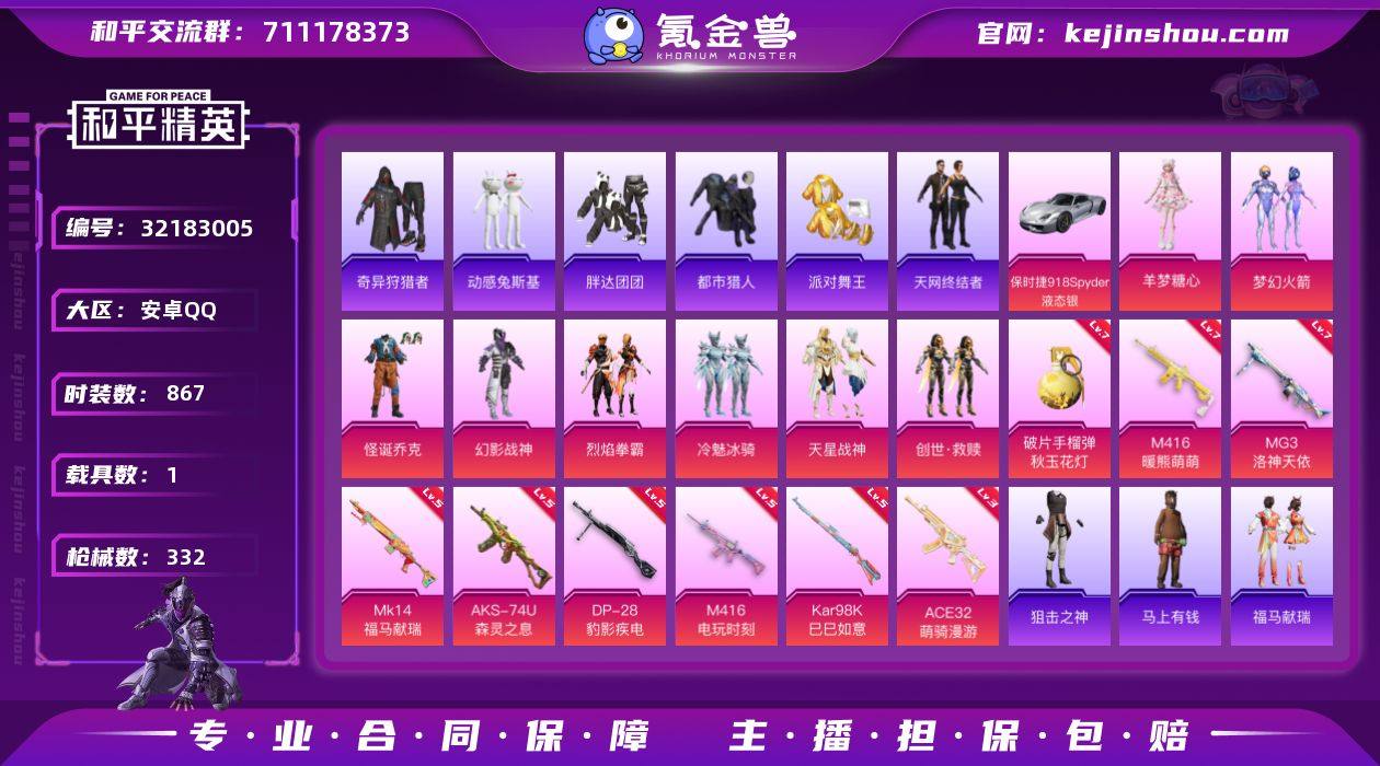 【主播推荐】实名: 不可修改 时装数: 867 载具数: 1 枪械数: 332 战备数: 209 热门装扮: 奇异狩猎者,梦幻火箭(新101),幻影战神,怪诞乔克,鹰眼刺客,都市猎人,烈焰拳霸,冷魅冰骑,大橘为重,胖达团团,动感兔斯基,派对舞王,天星战神,创世·救赎,羊梦糖心 载具: 保时捷918Spyder(液态银) 稀有枪皮: MG3洛神天依,M416暖熊萌萌,M416电玩时刻,破片手榴弹秋玉花灯,Kar98K-巳巳如意,DP-28-豹影疾电,AKS-74U-森灵之息,ACE32-萌骑漫游