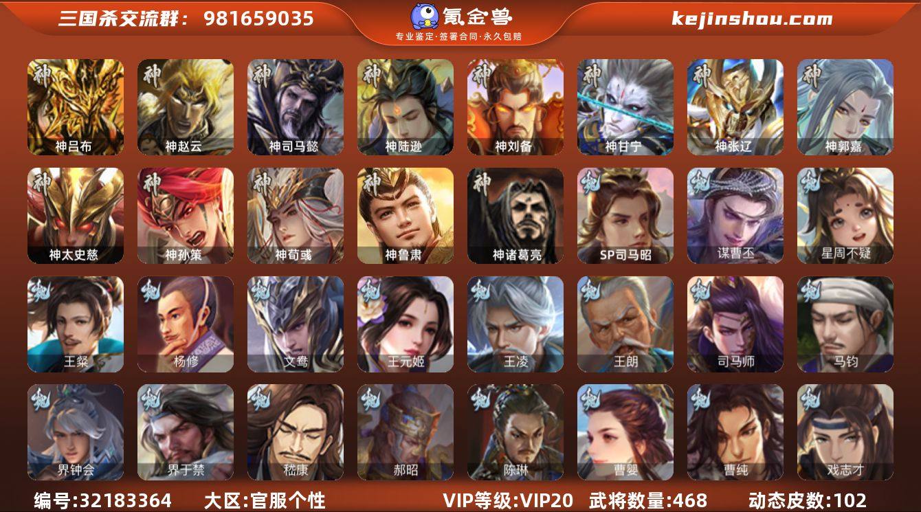 [15337614]标题:S35251 VIP等级:VIP20 官阶:大将军 史诗武将数量:87 动态皮肤数量:102 史诗宝珠数量:6 将魂数量:5569 雁翎数量:57590 心愿积分:17043 史诗武将(魏国):文鸯,谋曹丕,马钧,曹婴,王元姬,界钟会,戏志才,王朗,SP司马昭,司马师,星周不疑,王凌,嵇康,杨修,陈琳,刘晔,王粲,界于禁,程昱,曹纯,郝昭 史诗武将(蜀国):谋黄忠,谋关羽,谋诸葛亮,谋赵云,沙摩柯,关索,周群,花鬟,谯周,张星彩,王平,诸葛瞻,界黄忠,马云禄,董允,赵襄,谋马超 史诗武将(吴国):谋黄盖,孙寒华,界徐盛,留赞,骆统,周处,界步练师,界朱然,吴景,贺齐,孙皓,文鸯 史诗武将(群雄):刘焉,十常侍,徐荣,杜预,杨彪,界左慈,张琪瑛,祢衡,南华老仙,许攸,谋公孙瓒,麹义,庞德公,裴秀,界李儒,张让,司马徽,王允,卑弥呼,左慈,兀突骨,沮授,陶谦,士燮,苏飞,公孙康 史诗武将(神将):神郭嘉,神荀彧,神甘宁,神孙策,神鲁肃,神太史慈,神赵云,神陆逊,神司马懿,神吕布,神张辽,神刘备 其他亮点:欢乐豆25154,有年卡.