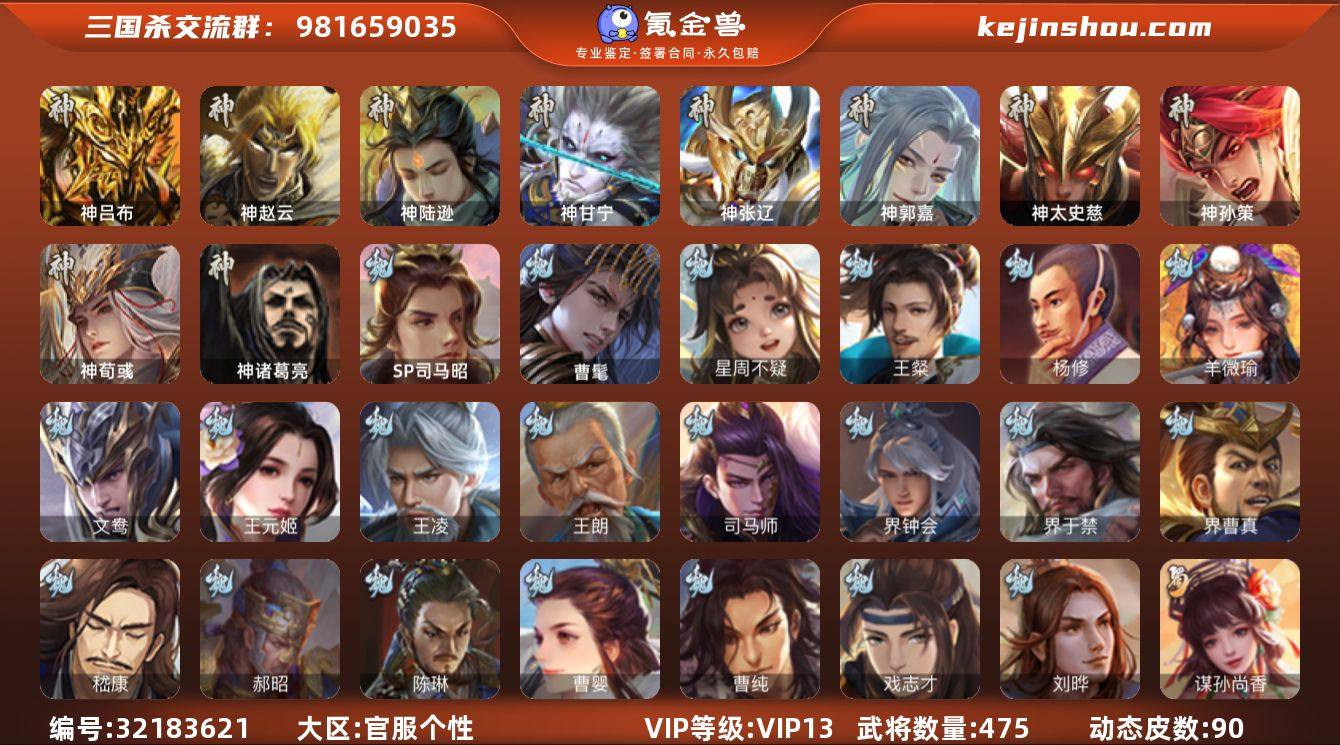 [17146777]标题:S36156 VIP等级:VIP13 官阶:大将军 史诗武将数量:88 动态皮肤数量:90 史诗宝珠数量:2 将魂数量:3112 雁翎数量:38659 心愿积分:14113 史诗武将(魏国):文鸯,曹髦,曹婴,王元姬,界钟会,戏志才,羊徽瑜,司马昭,王朗,SP司马昭,司马师,星周不疑,王凌,界曹真,嵇康,杨修,陈琳,刘晔,王粲,界于禁,程昱,曹纯,郝昭 史诗武将(蜀国):势魏延,谋黄忠,谋孙尚香,谋赵云,傅佥,沙摩柯,关索,周群,花鬟,谯周,张星彩,王平,诸葛瞻,界黄忠,马云禄,董允,赵襄,谋马超 史诗武将(吴国):孙寒华,界徐盛,留赞,骆统,势太史慈,周处,界步练师,界朱然,吴景,贺齐,孙皓,文鸯,谋孙尚香 史诗武将(群雄):刘焉,十常侍,星董卓,谋貂蝉,杜预,杨彪,界左慈,张琪瑛,祢衡,南华老仙,许攸,麹义,司马昭,谋张角,界李儒,星黄忠,张让,司马徽,审配,王允,卑弥呼,左慈,兀突骨,沮授,陶谦,士燮,苏飞,公孙康 史诗武将(神将):神郭嘉,神荀彧,神甘宁,神孙策,神太史慈,神赵云,神陆逊,神吕布,神张辽