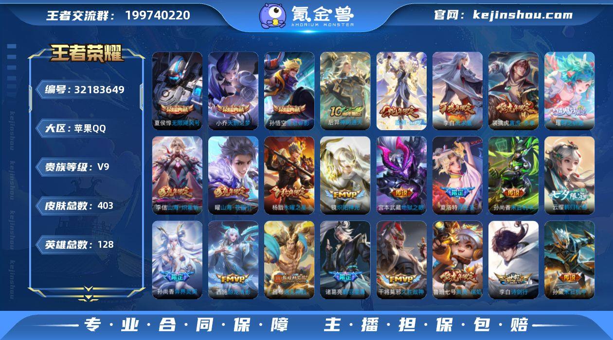 0B5BYB"403皮肤水晶3传说39优质限定24 qq钱包已注销 信用分合格 星会员已关联 水晶皮肤:无限飓风号,全息碎影,天鹅之梦, 传说限定:遇见神鼓,追逃游戏(亚瑟),永曜之星,山海·炽霜斩,浮生妄,愿照·山河定,凤求凰,寅虎·赤拳,电玩·雷克斯,鹤归松栖(云缨),鹤羽星尊,异界灵契,寅虎·瑞焰,炽翼辉光,时之祈愿-瑶,零号·赤焰,山海·苍雷引,神树通天,启明星使, 传说皮肤:音你心动-小乔,乞巧织情,游龙清影,末日机甲-孙尚香,黄金射手座,花朝如约,灼幽烈阳,胖达荣荣,末日机甲-孙策,淬星耀世,地狱之眼,诗剑行,地狱火,时之恋人-刘备,炽阳神光,音你心动-周瑜,猫影幻舞,黄金白羊座,久胜战神,超时空战士-狄仁杰, 史诗限定:寅虎·御盾,百相守梦(关羽),器灵·浮梦炉,雪夜绮愿(周瑜),匿光破解者, 新史诗皮肤:浮梦罗烟,石田雨龙,百相守梦-黄忠,末日机甲-莱西奥, 优质史诗皮肤:天秀·启明,永昼,暗渊魔法,晚萤,修罗,赏金猎手,玫瑰异探,时之奇旅-安琪拉,魅语,诗语江南, 周年皮肤:鹤鸣心笺,神树通天, 珍宝阁:优雅恋人, 史诗皮肤:地狱岩魂,星夜王子,圣诞狂欢,末日机甲-吕布,无心,乘风破浪,幽灵船长,苍穹之光,功夫厨神,德古拉伯爵,水晶猎龙者,心灵战警,未来纪元-赵云,节奏热浪,鬼剑武藏,千年之狐,紫霞仙子,暗隐猎兽者,冰冠公主,黎明之约,曙光守护者,原初追逐者,热力回旋,纤云弄巧,缤纷独角兽,金属风暴,龙骑士,魅力维加斯,女仆咖啡,摇滚巨星,暗夜贵公子,冰雪圆舞曲,圣诞恋歌,心灵骇客,偶像歌手,黄金分割率,拒霜思,水果甜心,电玩小子,鹰眼统帅,逐浪之夏,特工魅影,箭羽风息,天才门将,电玩·爆裂旋风,乱世虎臣,乐园奇幻夜,舞动绿茵,繁星吟游,华丽摇滚,猫狗日记-大乔, "